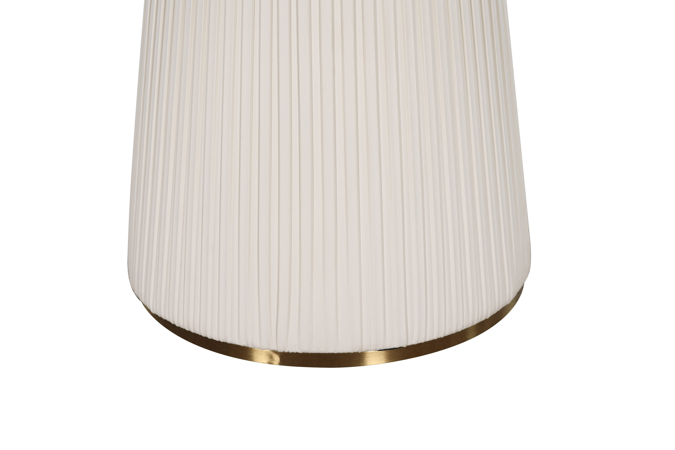 • Nowoczesny stół ze stożkową podstawą, pokryty białą ekologiczną skórą tworzącą pionowe plisy, zakończone złotym akcentem. Okrągły biały blat jest imitacją naturalnego marmuru.