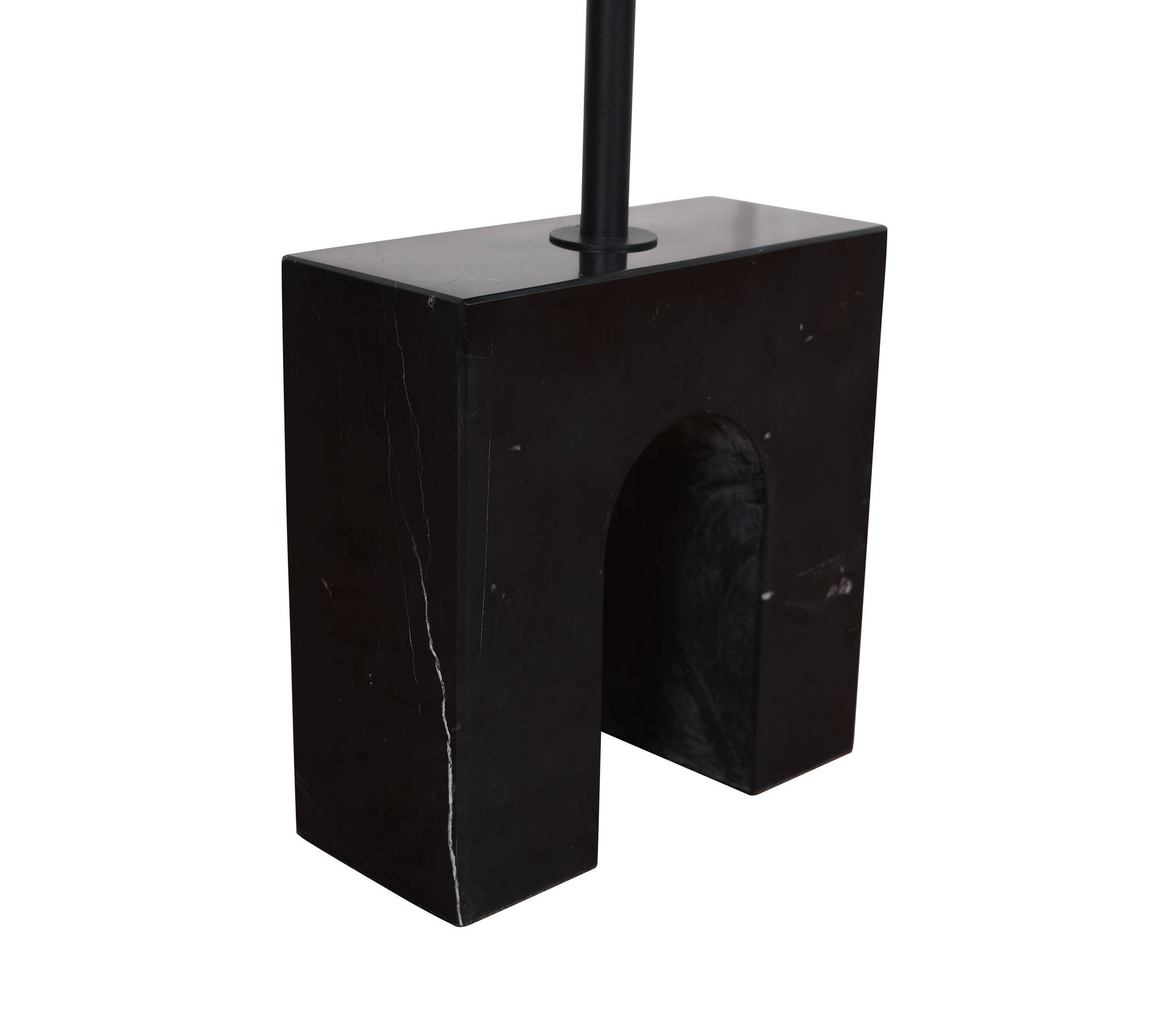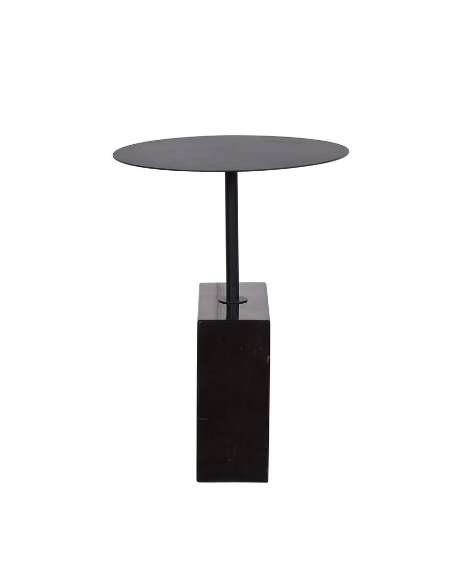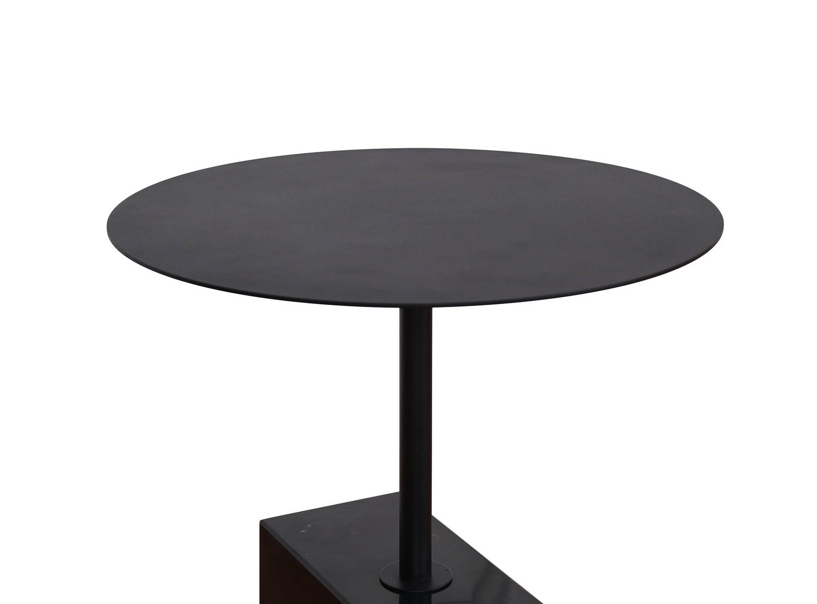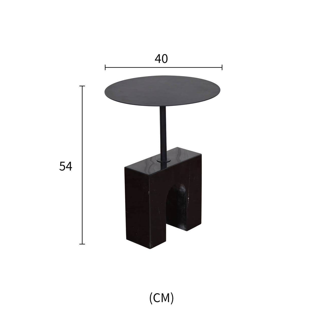 - Nowoczesny stolik z czarną podstawą imitującą marmur w kształcie łuku triumfalnego oraz czarnym, metalowym blatem na metalowym filarze połączonym symetrycznie z podstawą.