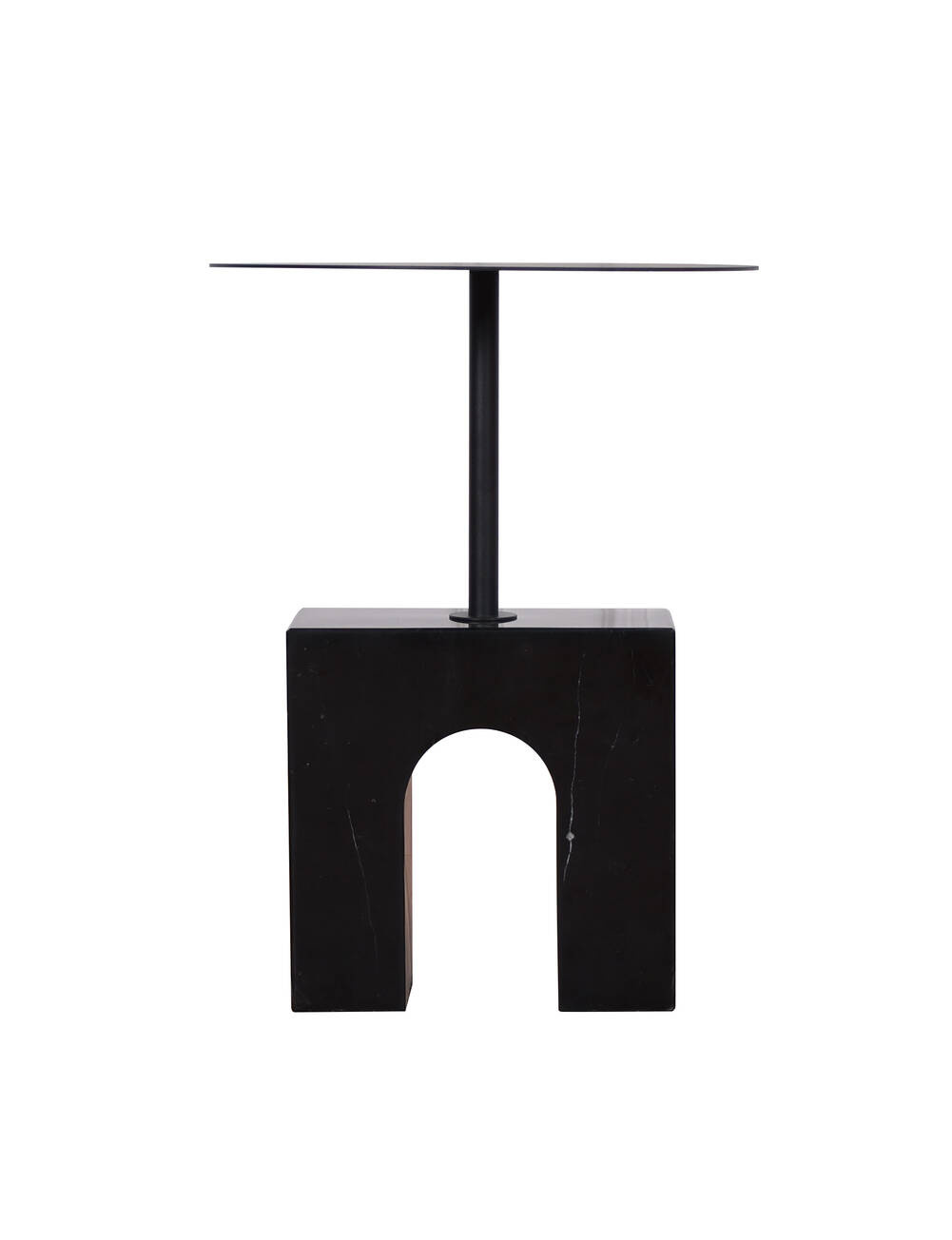 Nowoczesny stolik z czarną podstawą imitującą marmur w kształcie łuku triumfalnego oraz czarnym, metalowym blatem na metalowym filarze połączonym symetrycznie z podstawą.