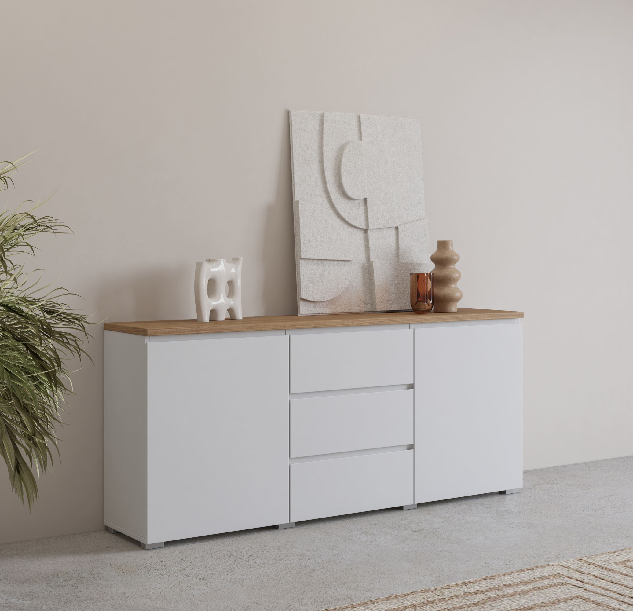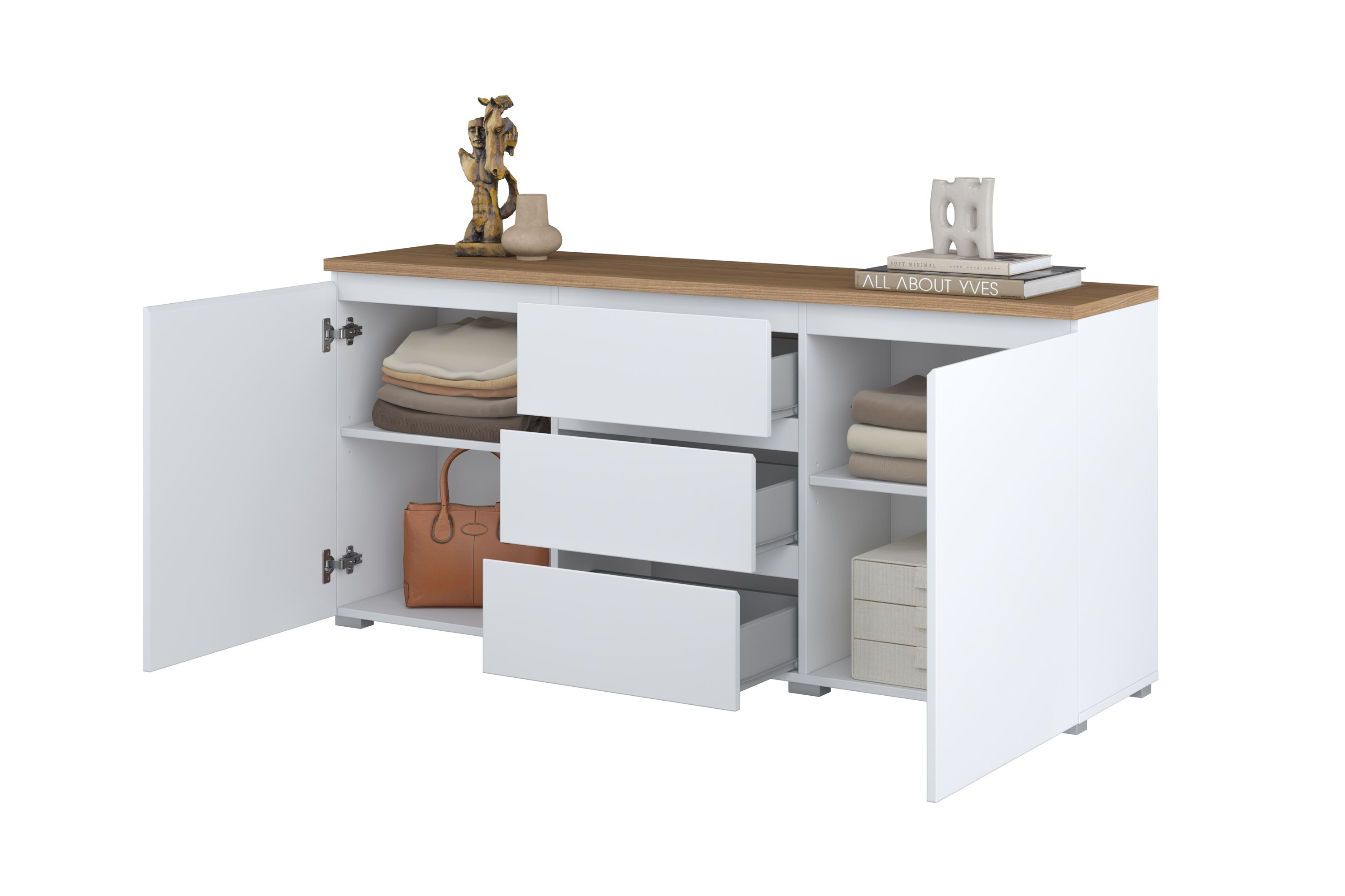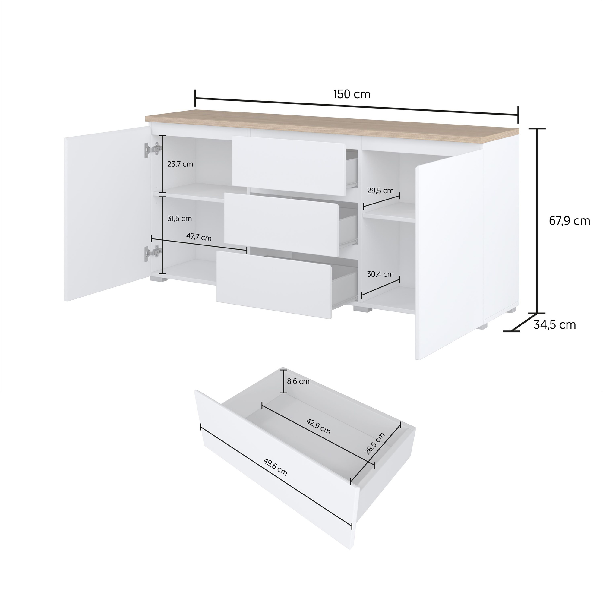 Komoda Modo nie tylko wprowadza ład do Twojego wnętrza, ale również dodaje mu przytulnego charakteru. Dzięki białemu matowemu korpusowi całe pomieszczenie staje się jaśniejsze i bardziej przestronne. Jej rozmiar (150 cm szerokości) sprawia, że pasuje zarówno do większych, jak i mniejszych przestrzeni, a delikatny dąb Mauvella dodaje jej elegancji, czyniąc ją nie tylko meblem, ale także ozdobą Twojego domu.