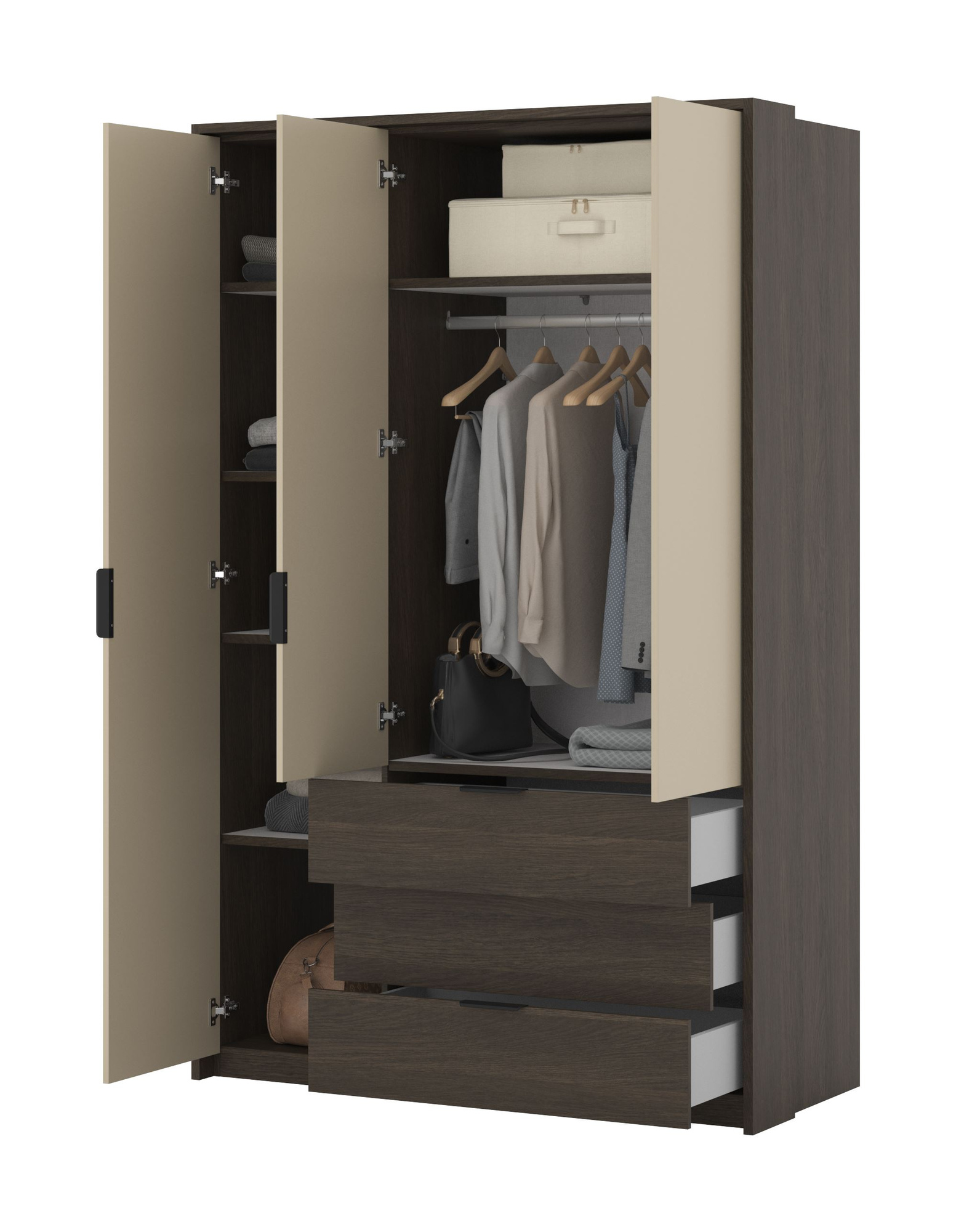 Zamiana chaosu na porządek stała się teraz prostsza! Szafa Mola, z szerokością 139 cm i wysokością 217 cm, oferuje przestronne wnętrze, które pomieści wszystkie Twoje ubrania, akcesoria i inne niezbędne przedmioty. Dzięki sprytnemu podziałowi na trzy drzwi, łatwo zorganizujesz swoje rzeczy, a codzienne wybieranie stylizacji stanie się przyjemnością. Pomyśl, ile czasu zaoszczędzisz dzięki temu funkcjonalnemu rozwiązaniu!