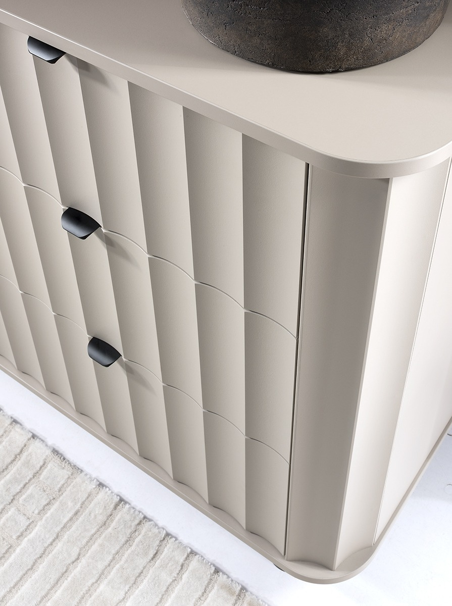 Komoda NOVADO-3 to doskonałe połączenie elegancji i praktyczności, które mile zaskoczy każdego miłośnika nowoczesnego designu. Zamieszczona w Twoim salonie lub sypialni, od razu przyciągnie wzrok dzięki swoim wyrafinowanym frezowanym frontom MDF oraz zaokrąglonym blatom, które nadają jej wyrazu i stylowego charakteru. Jej kolor Clay Gray idealnie wpasuje się w każde wnętrze, dodając mu subtelnej elegancji i przytulności.