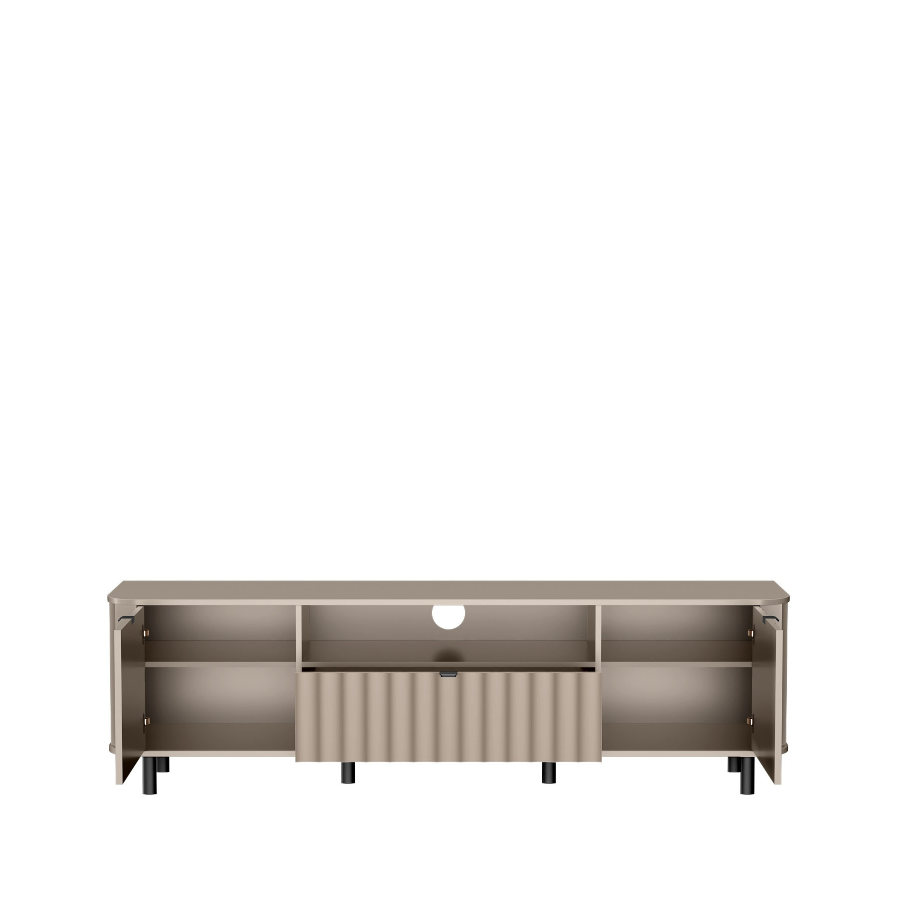 Komoda RTV NOVADO-5 w kolorze Clay Gray łączy nowoczesny design z funkcjonalnością. Oferuje 196 cm przestrzeni na multimedia, a cichy domyk i miękkie prowadnice zapewniają komfort użytkowania. Idealna podstawa pod telewizor dla minimalistycznych wnętrz.
