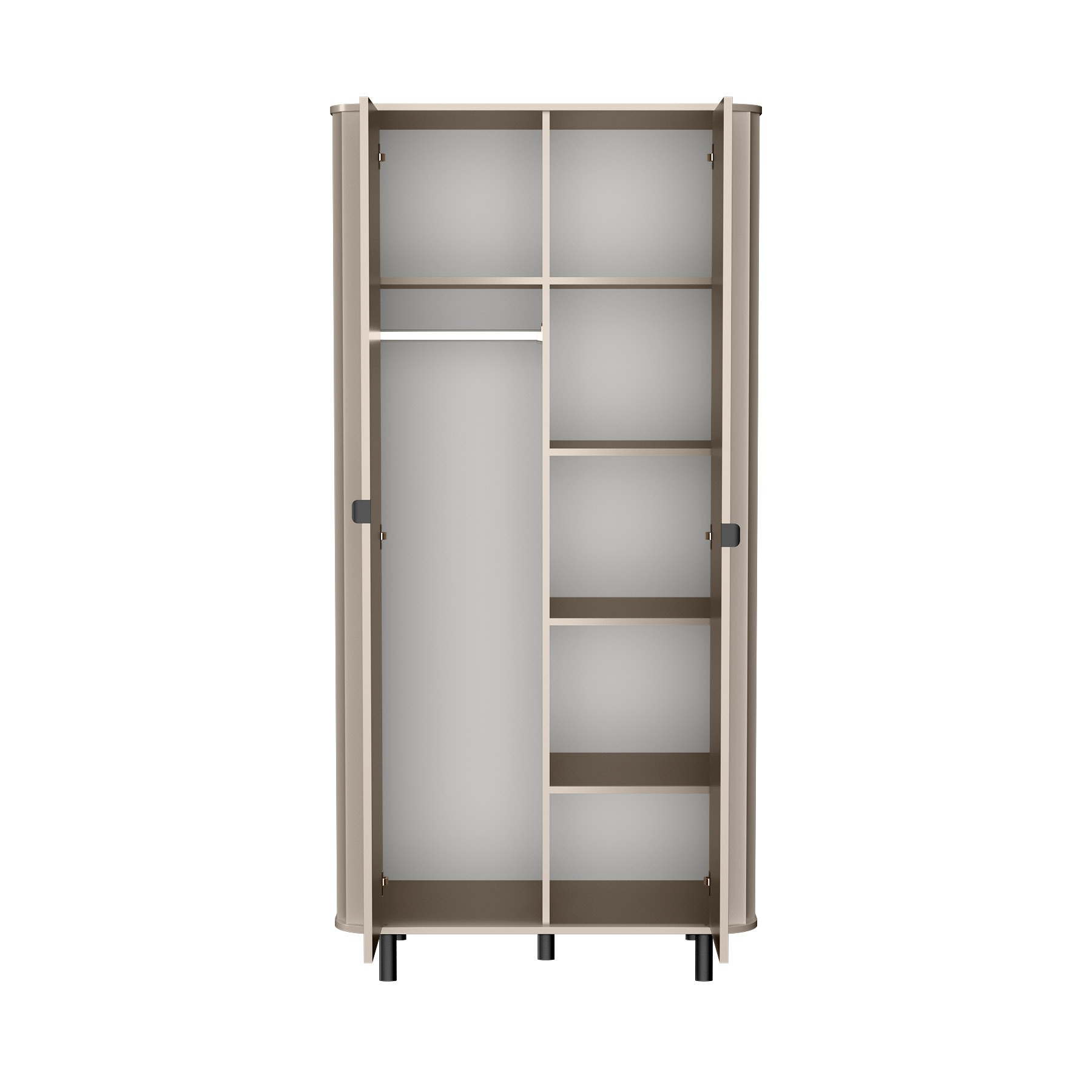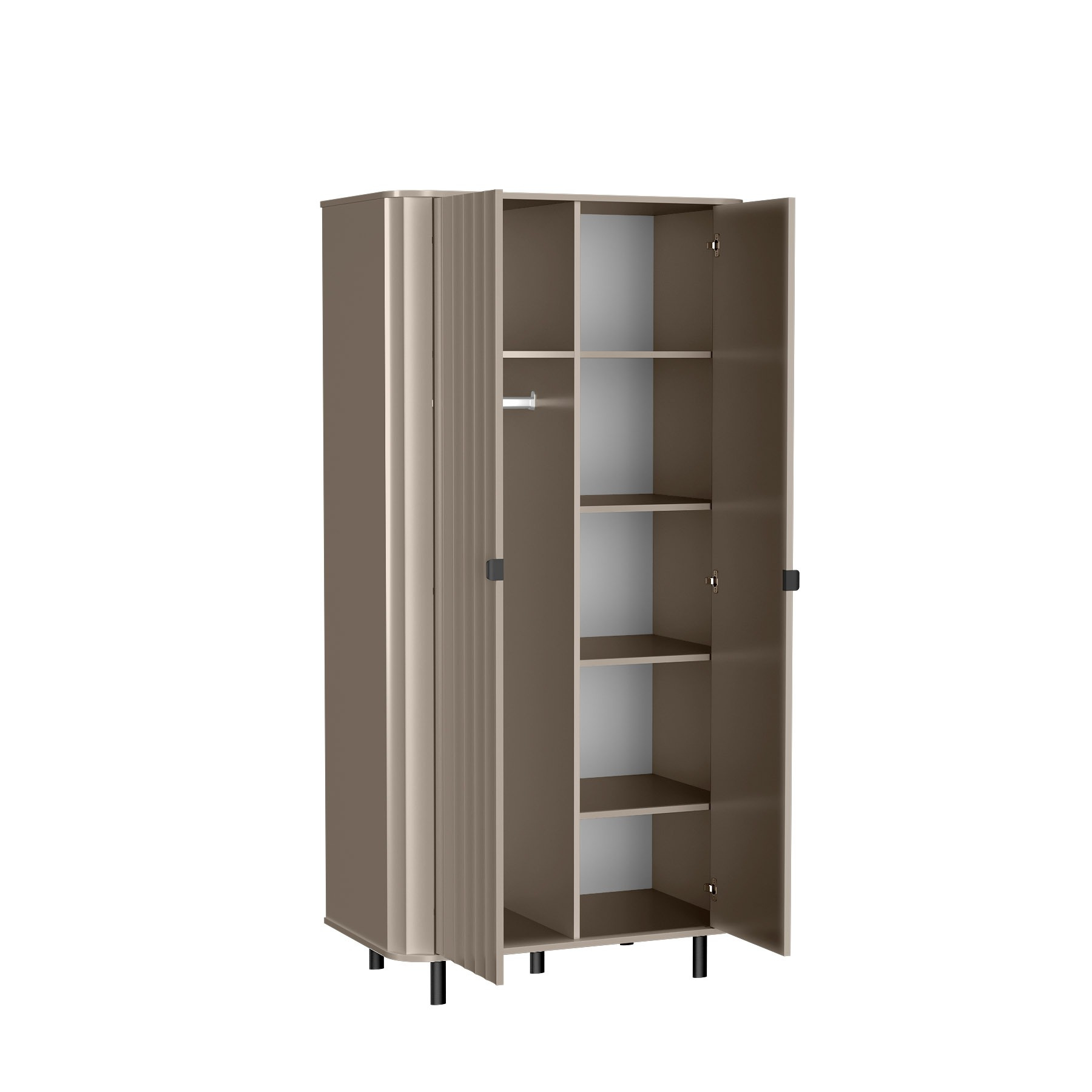 Nowoczesna szafa NOVADO-8 w odcieniu Clay Gray to idealne połączenie elegancji i funkcjonalności. Wyposażona w cztery pojemne półki oraz drążek na ubrania wiszące, ułatwi utrzymanie porządku. Subtelne metalowe uchwyty i zaokrąglone krawędzie nadają stylu.