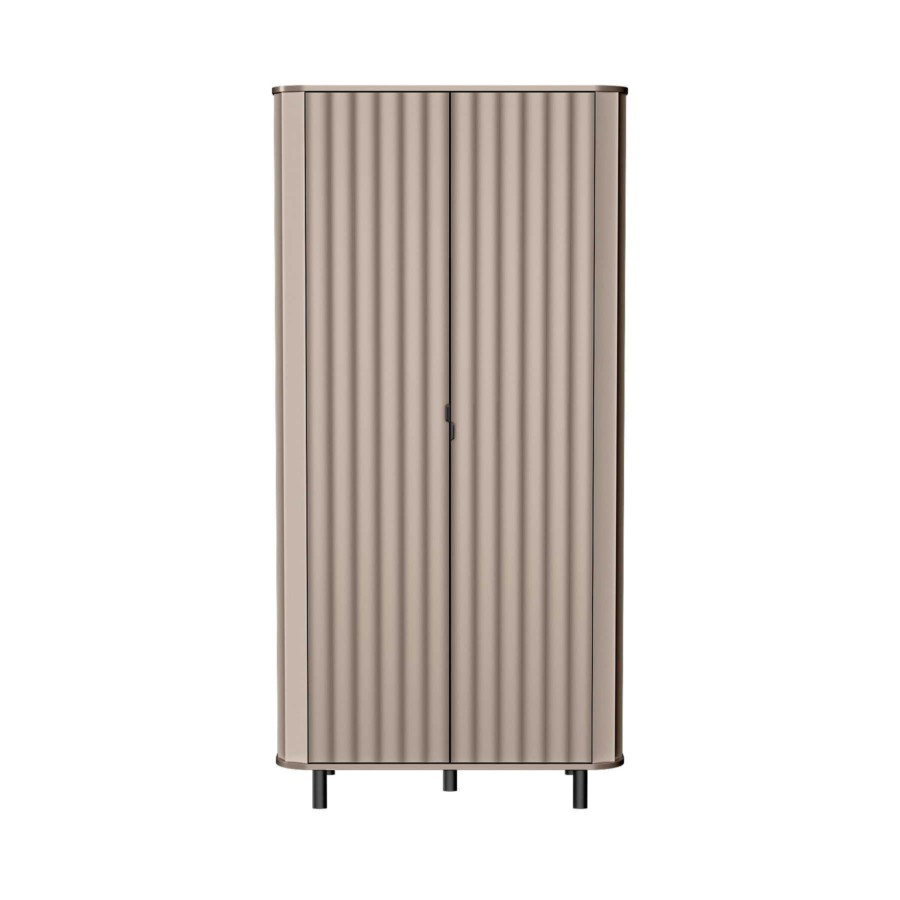 Nie można także zapomnieć o estetycznych detalach, które wnoszą do szafy wyjątkowy charakter. Zaokrąglone krawędzie oraz elegancki, metalowy uchwyt to elementy, które dodają subtelności i wytworności, sprawiając, że szafa doskonale wpisuje się w różnorodne style wnętrzarskie. Dodatkowo, intrygujące połączenie kolorów – ciepłego clay gray z czarnymi nogami – tworzy efektowny kontrast, który z pewnością przyciągnie wzrok gości.