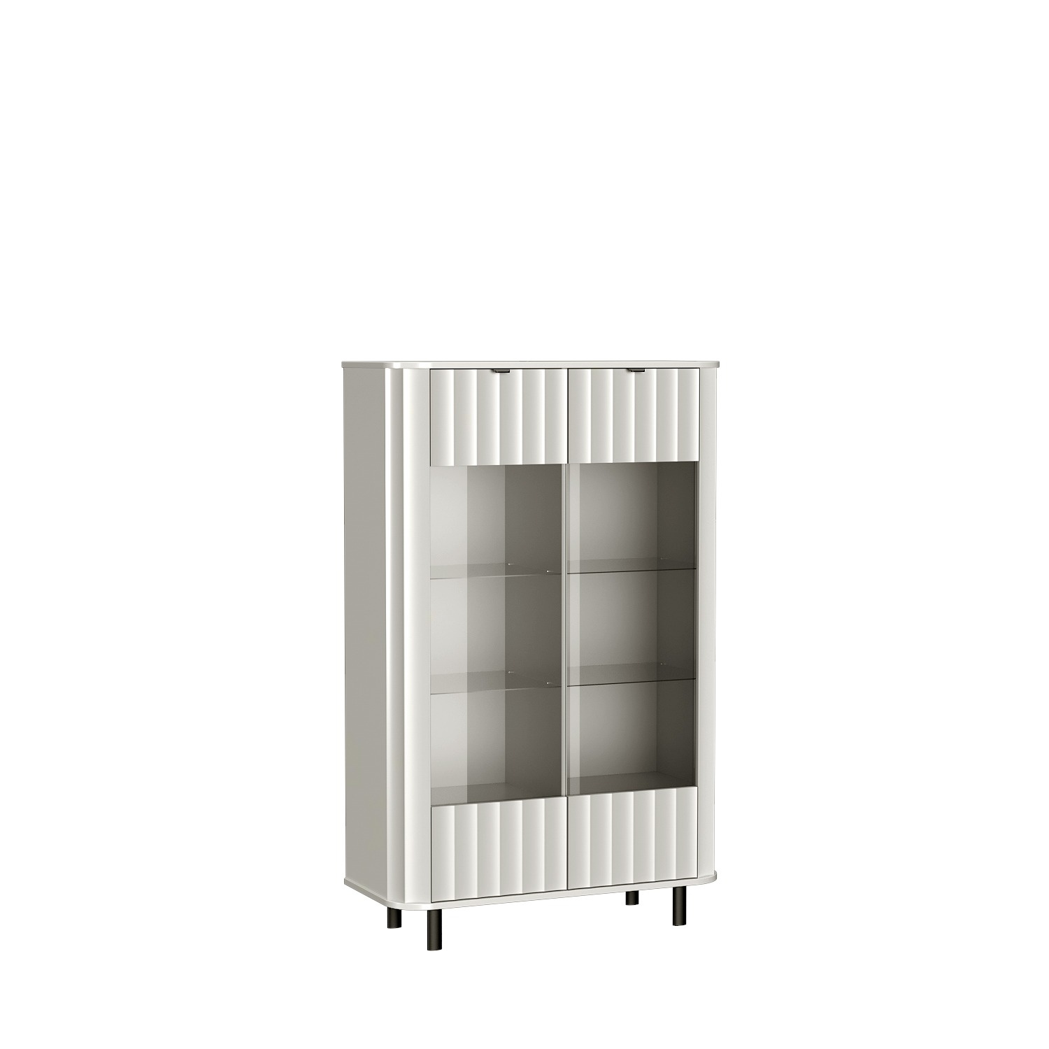Przeszklona konstrukcja witryny z czterema szklanymi półkami łączy w sobie lekkość z możliwością eksponowania ulubionych elementów dekoracyjnych, jak książki, zestawy porcelany czy wyjątkowe pamiątki. Każdy szczegół, jak zaokrąglone krawędzie oraz stylowe, metalowe uchwyty, doceniają nowoczesne podejście do wzornictwa. Dzięki nim witryna staje się nie tylko meblem, ale także dziełem sztuki w Twoim domu.