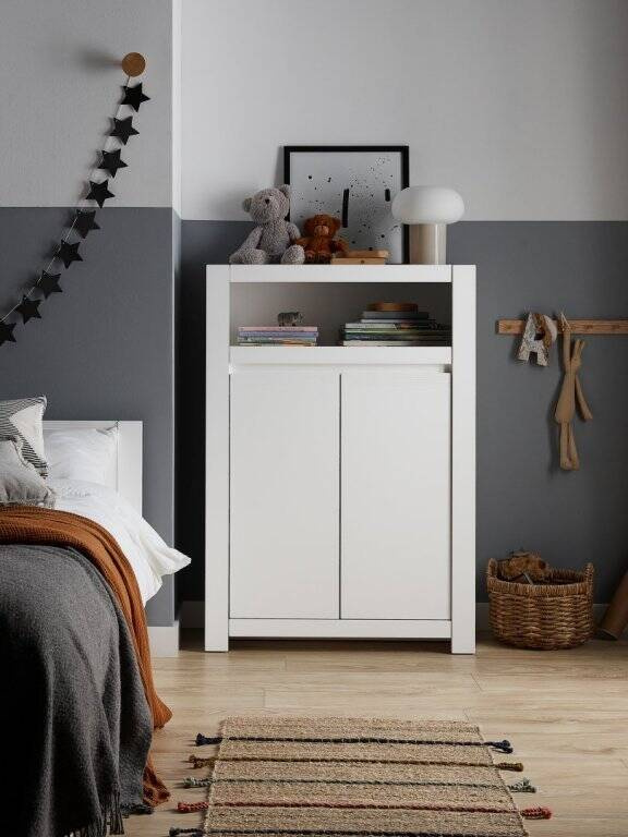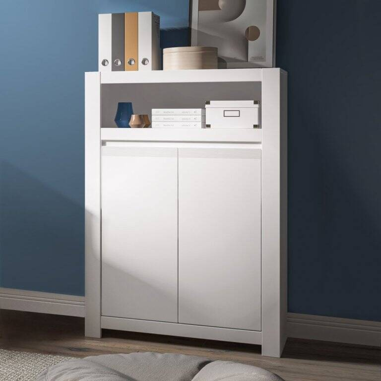 Elegancka komoda Novi NVIK02 w bieli z ryflowanymi detalami i bezuchwytowym systemem drzwi, gwarantuje bezpieczeństwo i nowoczesny wygląd. Pojemne wnętrze z regulowanymi półkami ułatwi organizację przestrzeni.
