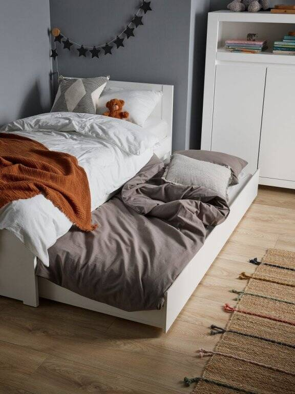 Łóżko wyposażone jest w funkcjonalną szufladę, która z łatwością może posłużyć jako dodatkowe miejsce do spania bądź jako pojemnik na pościel. Szuflada, dostosowana do materaca o wymiarach 80 x 190 cm i wysokości do 15 cm, oferuje dodatkową przestrzeń, niemal niewidoczną na co dzień. Możliwość montażu szuflady zarówno z lewej, jak i z prawej strony łóżka sprawia, że pasuje ono do każdego ustawienia i wymiaru pokoju.