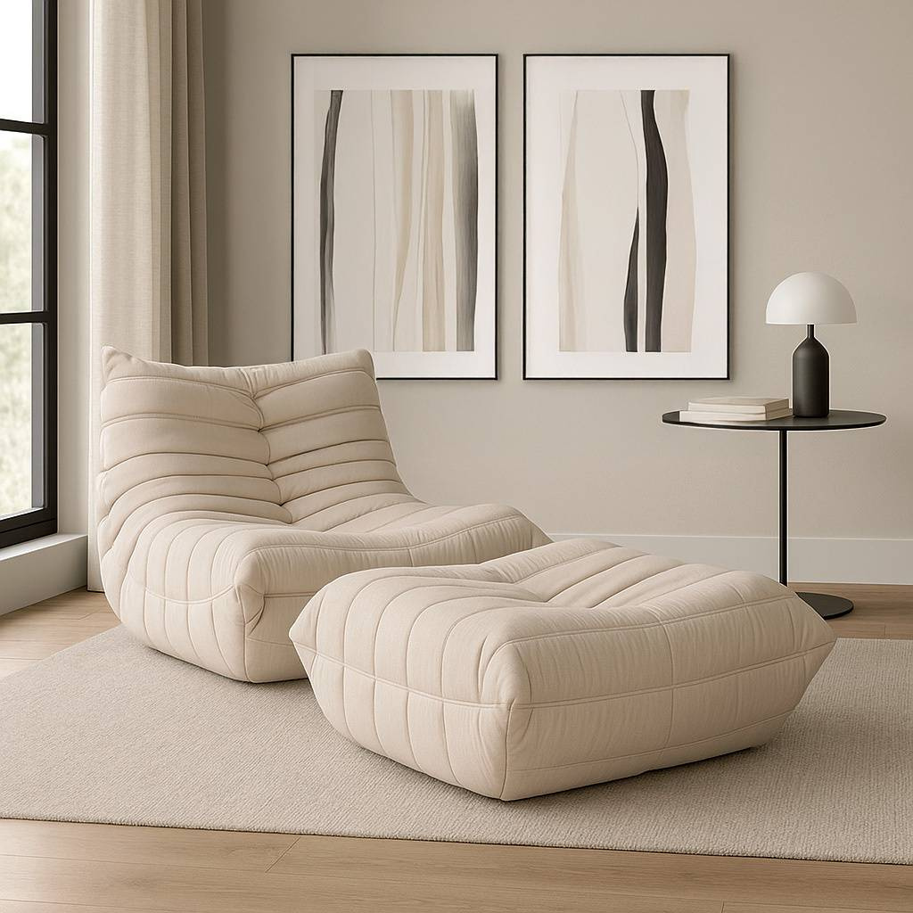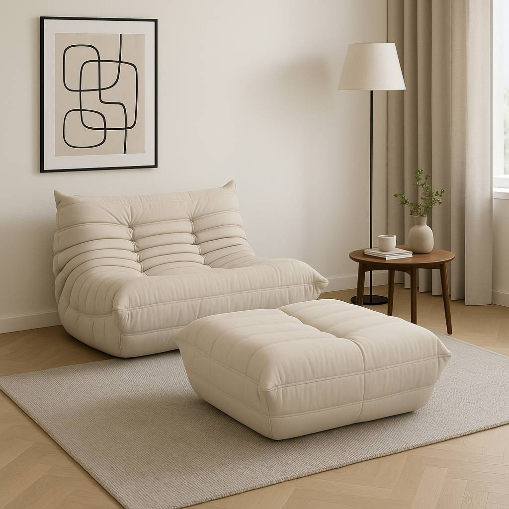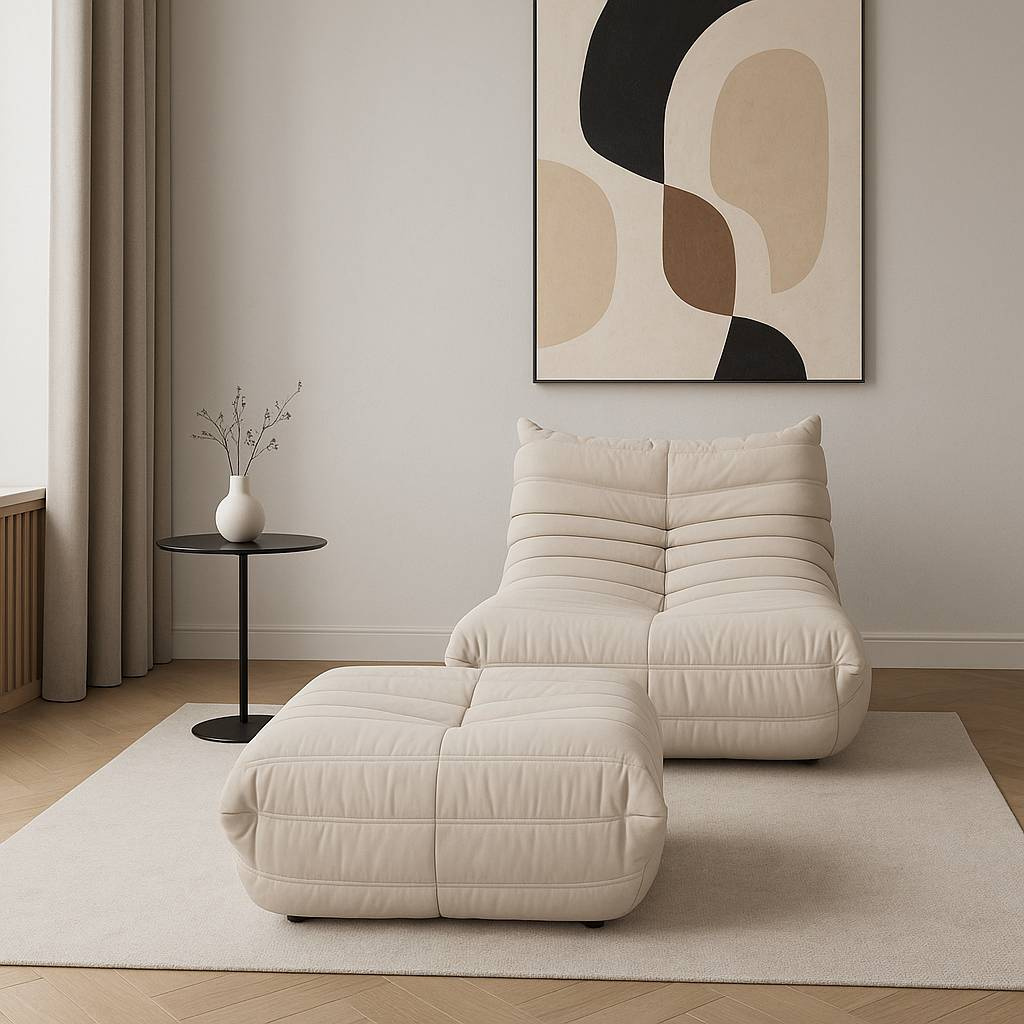 Podnóżek Nua N22-4 marki Livinhill to elegancki, jasnobeżowy akcent z aksamitnej bawełny. Jego nowoczesny design, z poziomym przeszyciem i pikowaniem, doskonale wkomponuje się w każde wnętrze. Doskonały uzupełnienie fotela z tej samej serii.