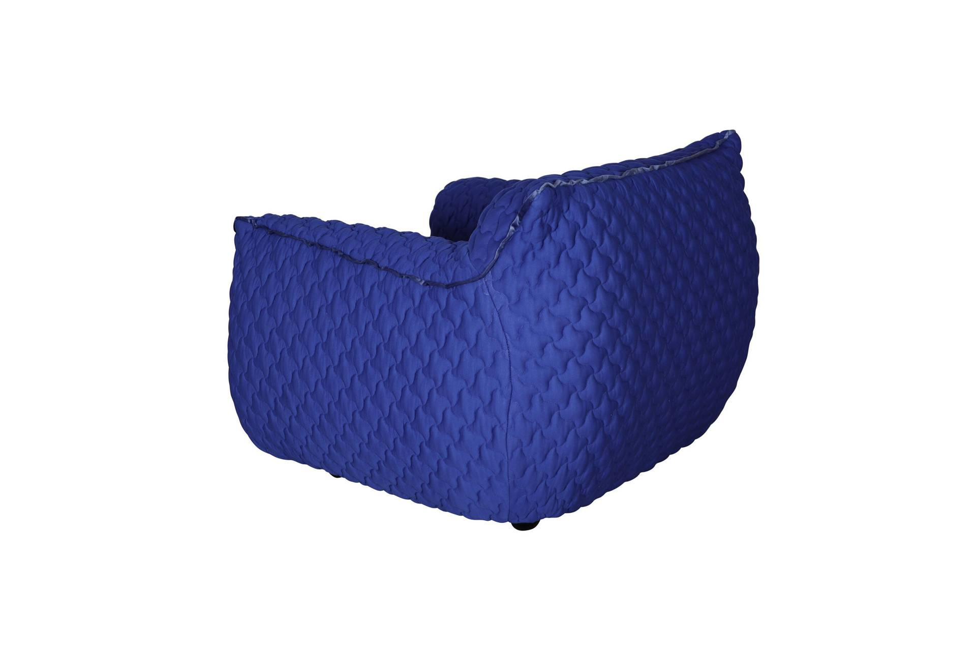 Nowoczesny, duży fotel o obłym kształcie. Elastyczna tkanina w kolorze chabrowym posiada pikowania na kształt czteroramiennych gwiazd. Fotel wypoczynkowy to połączenie prostej formy z miękkim wypełnieniem z gąbki i oryginalną strukturą materiału.