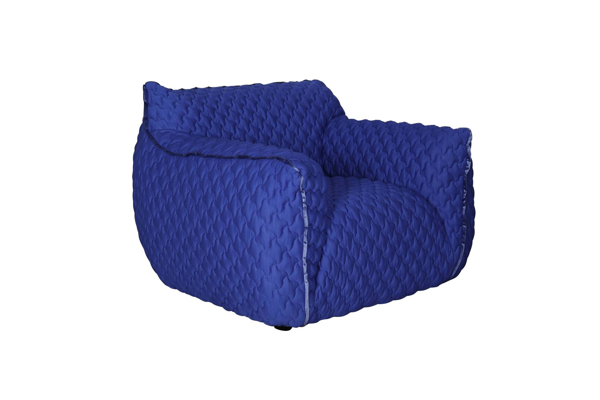 - Nowoczesny, duży fotel o obłym kształcie. Elastyczna tkanina w kolorze chabrowym posiada pikowania na kształt czteroramiennych gwiazd. Fotel wypoczynkowy to połączenie prostej formy z miękkim wypełnieniem z gąbki i oryginalną strukturą materiału.