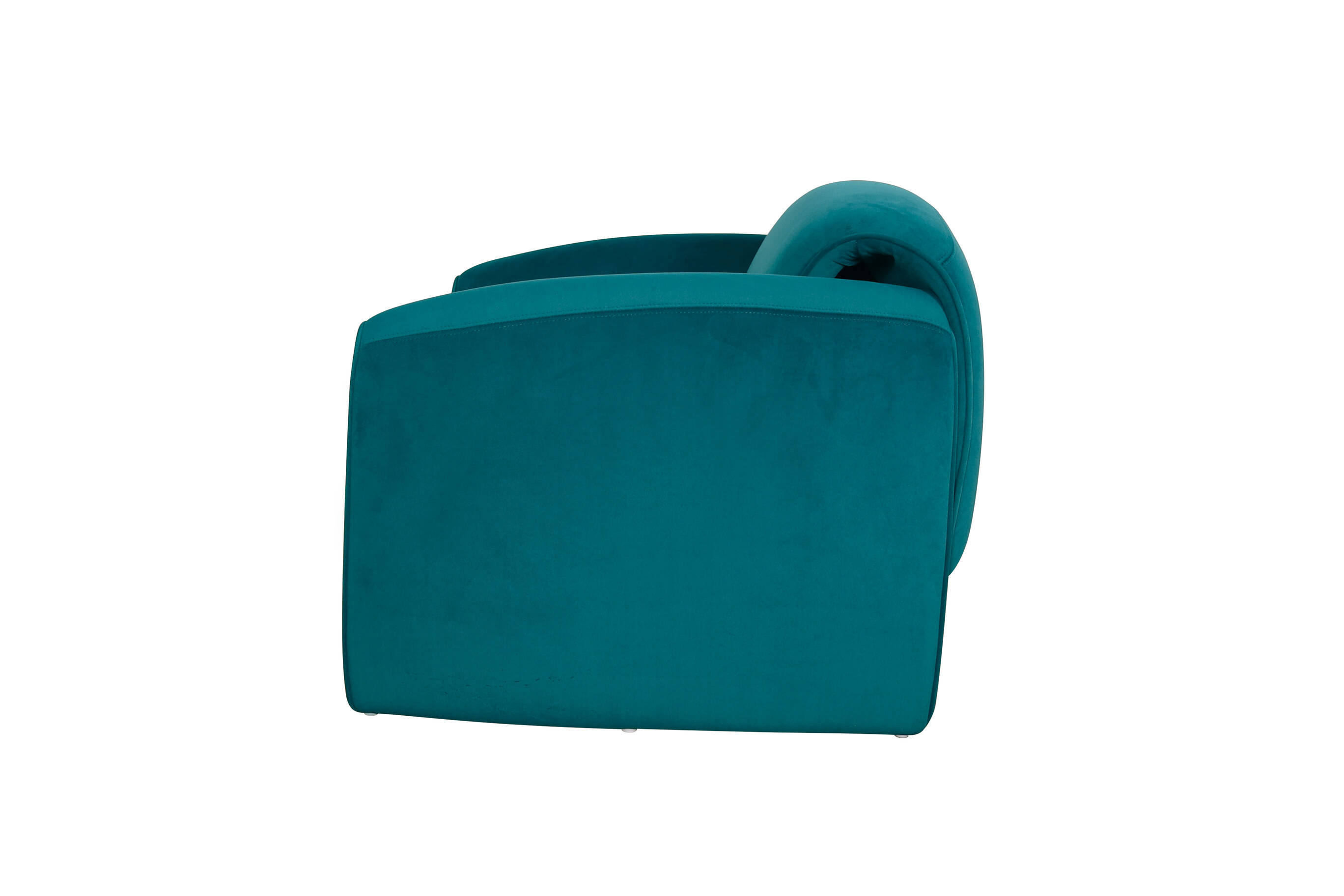 Nowoczesny fotel tapicerowany w kolorze morskim z welurową tkaniną. Minimalistyczna, geometryczna forma i staranne wykończenie pozwalają na dopasowanie produktu do każdego wnętrza.