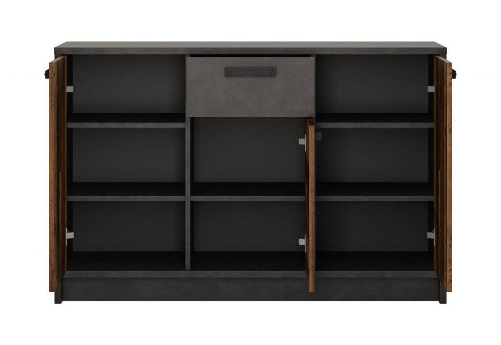 Komoda Nubi 3D1S w atrakcyjnej kombinacji kolorów Matera Ciemna/Old Style. Oferuje obszerne przechowywanie z trzema drzwiami i jedną szufladą, na wytrzymałej płycie laminowanej, idealna do nowoczesnych wnętrz.