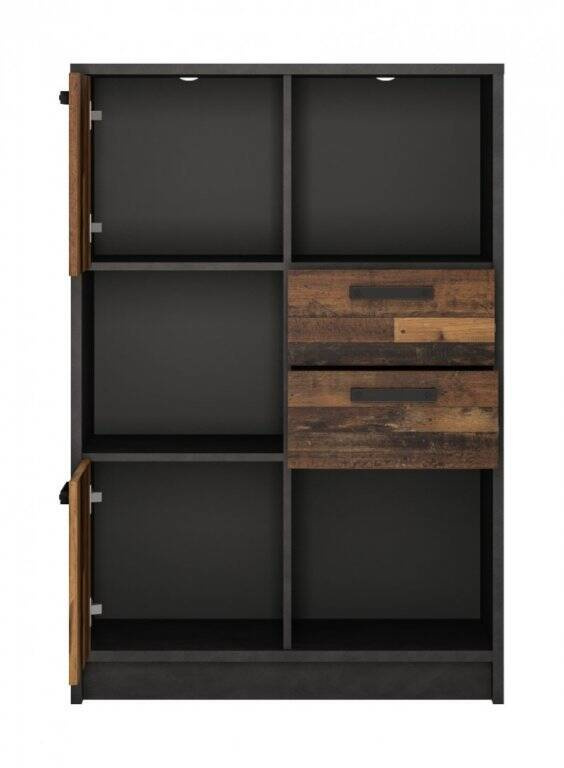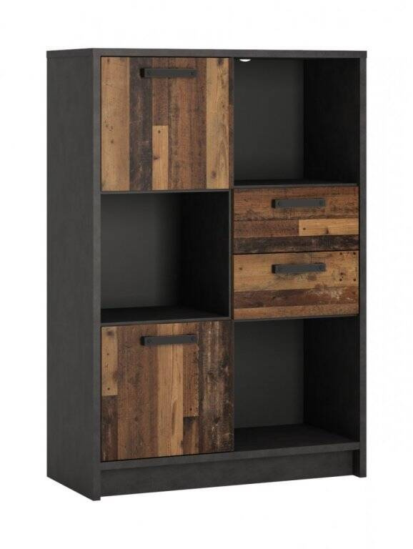 Praktyczny regał NUBR02 z linii Nubi o przemysłowym charakterze, łączy czarny korpus z kontrastowymi frontami w odcieniach Matera Ciemna/Old Style. Oferuje 2 szuflady i zamknięte przestrzenie na drobiazgi oraz otwarte półki na dekoracje.