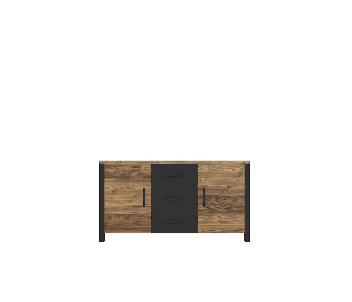 Komoda Olin WM 2D3S łączy w sobie funkcjonalność i nowoczesny styl loftowy. Dwukolorowe fronty w połączeniu z czarnymi, matowymi elementami oraz praktyczne szuflady na prowadnicach kulkowych, czynią ją idealną do eleganckich wnętrz.