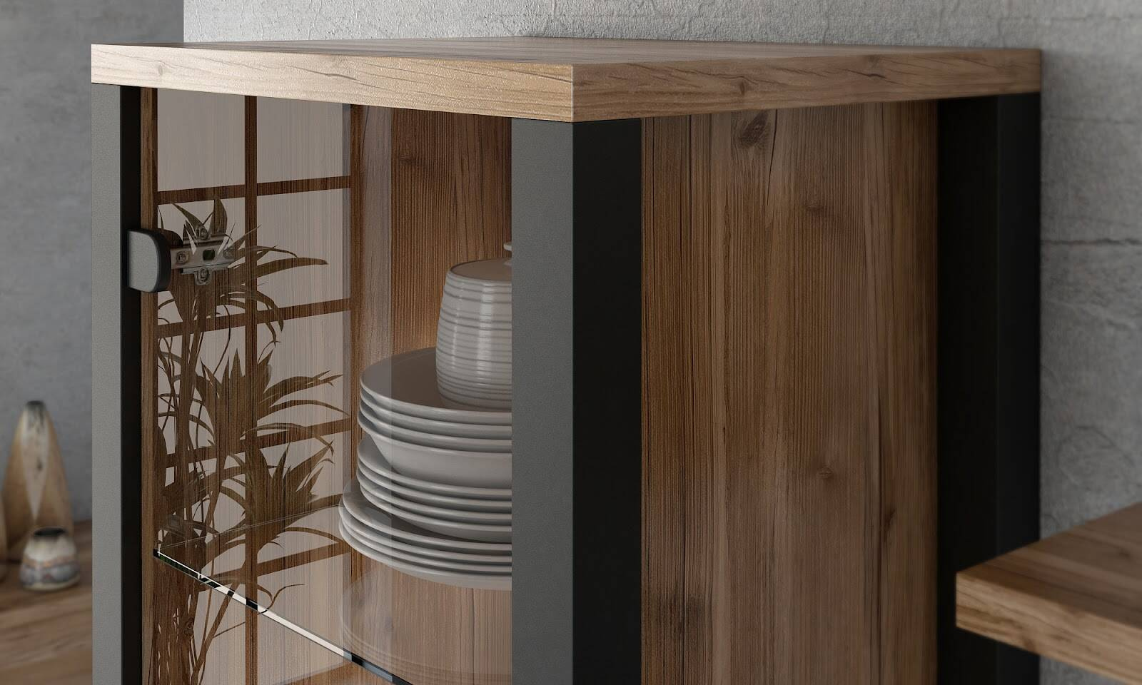 Witryna ta stanowi doskonałe połączenie czarnego matu z naturalną barwą dębu grand, dodając przestrzeni surowego, ale jednocześnie ciepłego uroku. Opcjonalne oświetlenie LED dostępne w przeszklonych segmentach pozwala na stworzenie przytulnej atmosfery i stanowi dodatkowy element dekoracyjny. Z kolei praktyczne uchwyty o prostej formie, wykonane z tworzywa sztucznego, zapewniają komfort użytkowania i subtelnie akcentują cechy mebla.