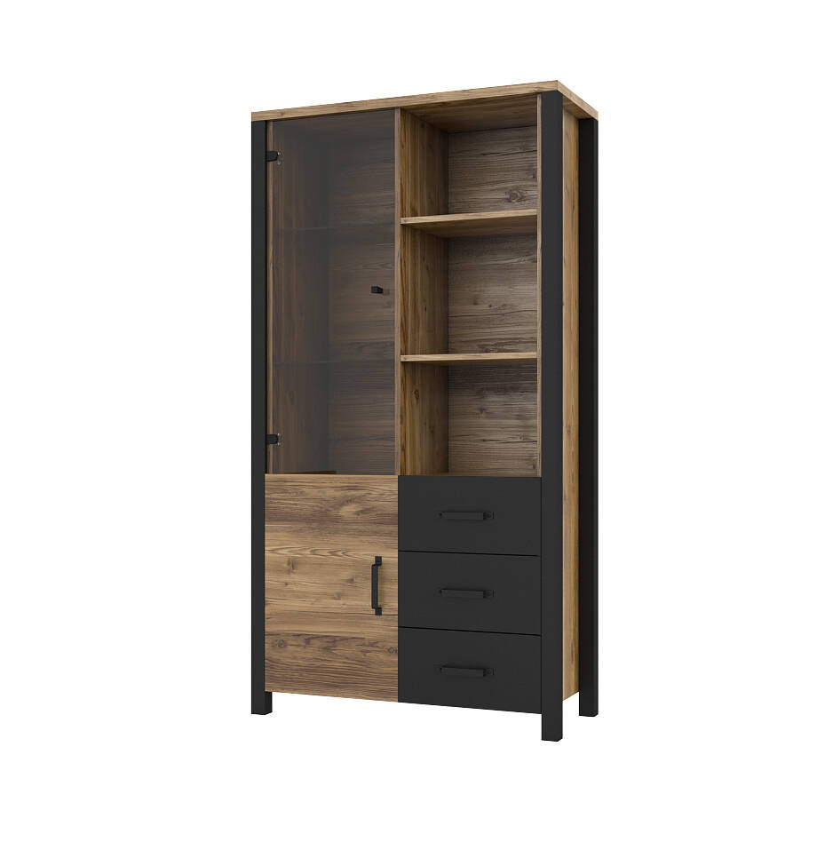 - Witryna Olin 2D3S łączy w sobie styl loftowy z funkcjonalnością: przestronna z sześcioma półkami i trzema szufladami, prezentuje eleganckie połączenie matowej czerni i naturalnego dębu.