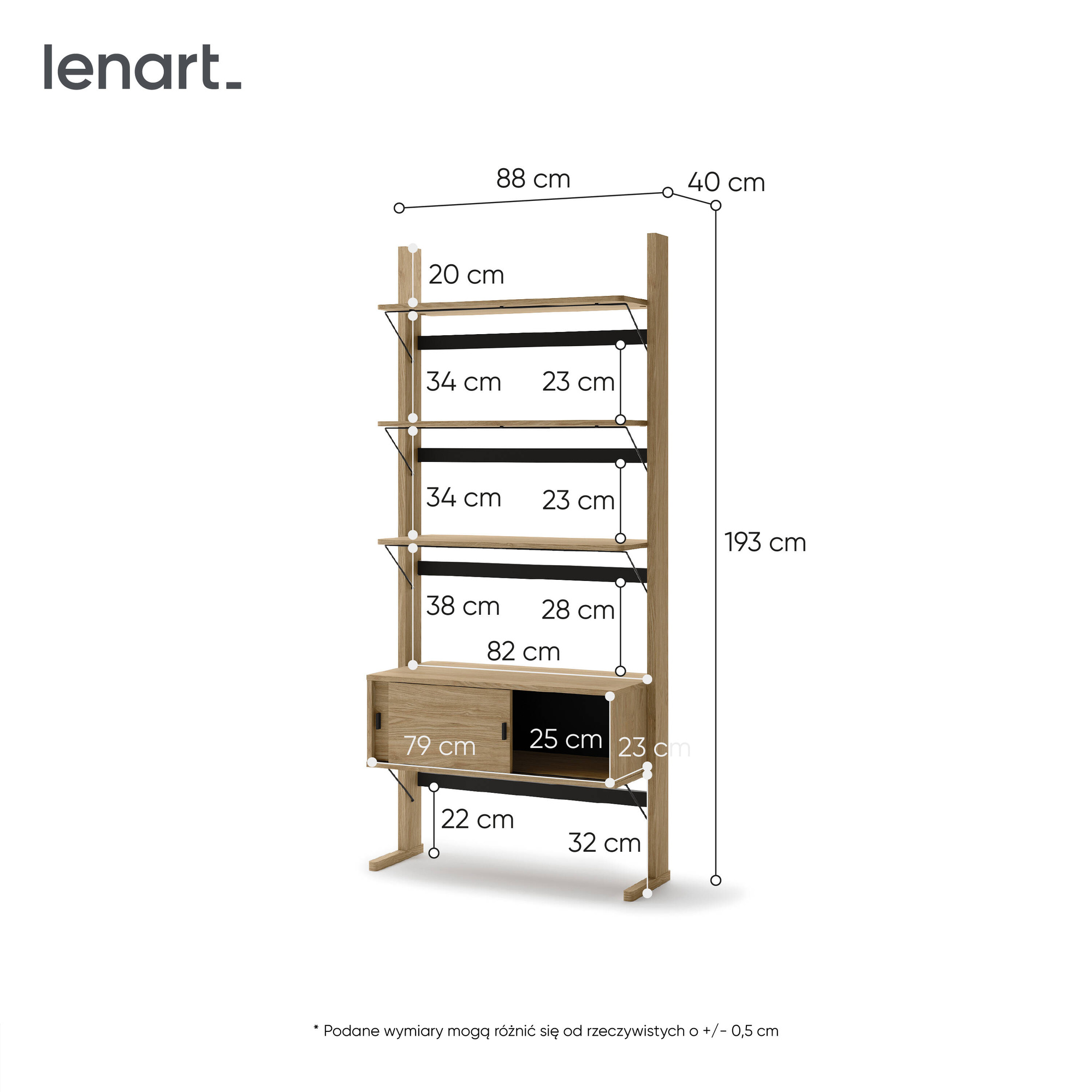 Przemyślana koncepcja regału OLLIE OL-01 nie tylko sprzyja ergonomii, ale również optymalizacji przestrzeni. Wysokość 193 cm oraz szerokość 88 cm sprawiają, że regał stanie się centralnym punktem każdego pomieszczenia, przyciągając wzrok i zachęcając do zorganizowania przestrzeni w nowoczesny sposób. Czarne tło tylnej ściany w połączeniu z dębami olejowanymi frontami wprowadza stylowy kontrast, który podkreśli elegancję Twojego wnętrza.