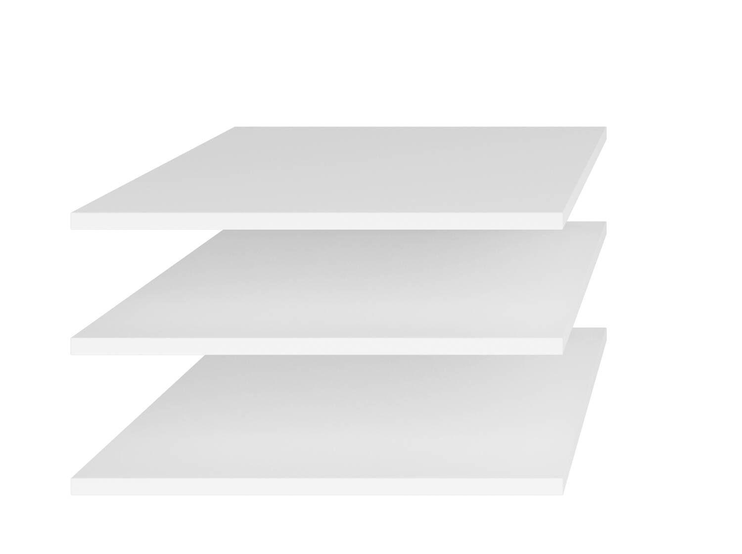 Zestaw 3 białych półek Optima do szaf, wykonanych z laminowanej płyty meblowej. Szerokość: 77 cm, głębokość: 56 cm. Idealne do samodzielnego montażu i organizacji przestrzeni.