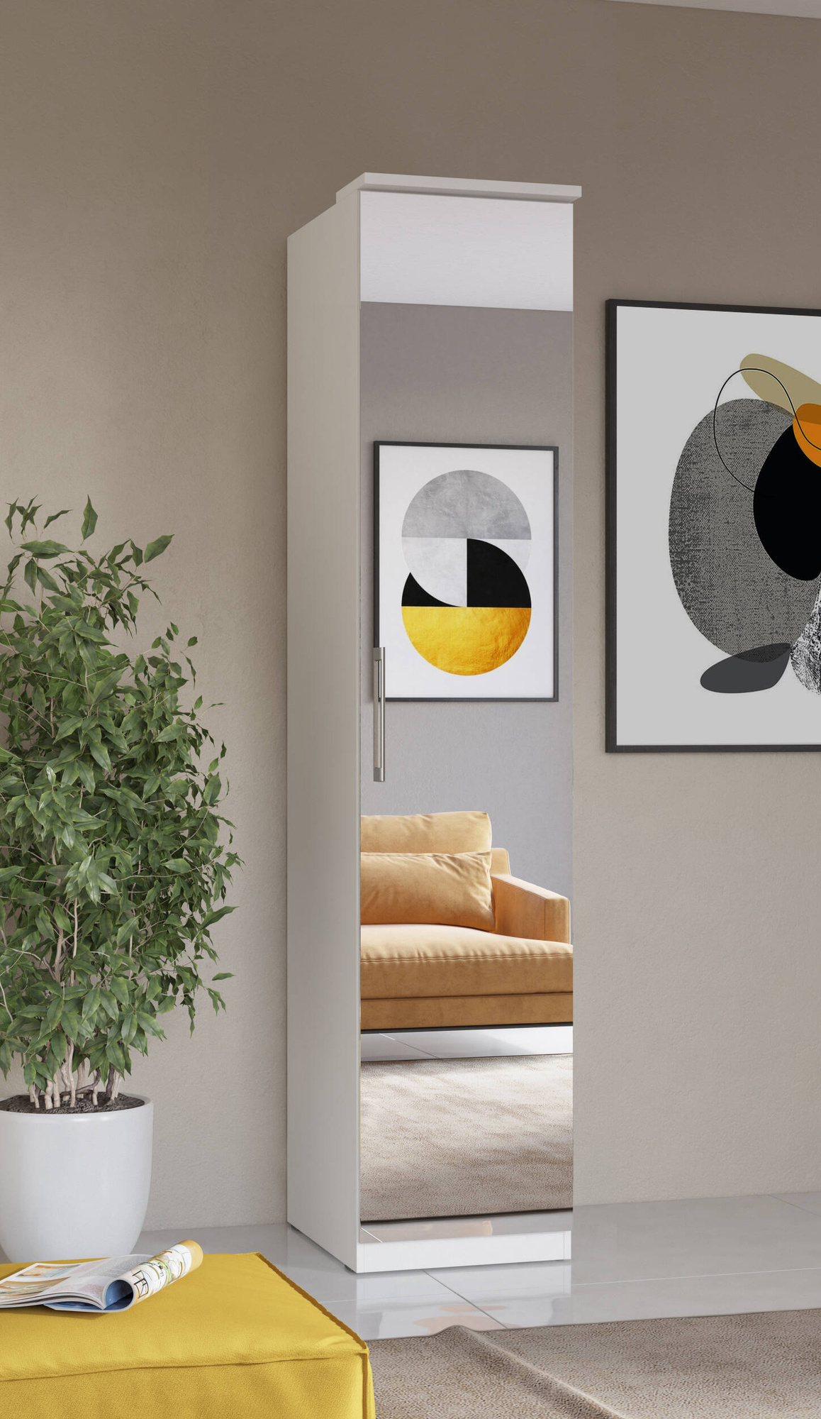 - Szafa 1-drzwiowa Optima z lustrem w kolorze białym. Wys. 217 cm, szer. 45 cm, gł. 63 cm. Wykonana z laminowanej płyty, 4 półki. Do samodzielnego montażu, LED opcjonalnie.