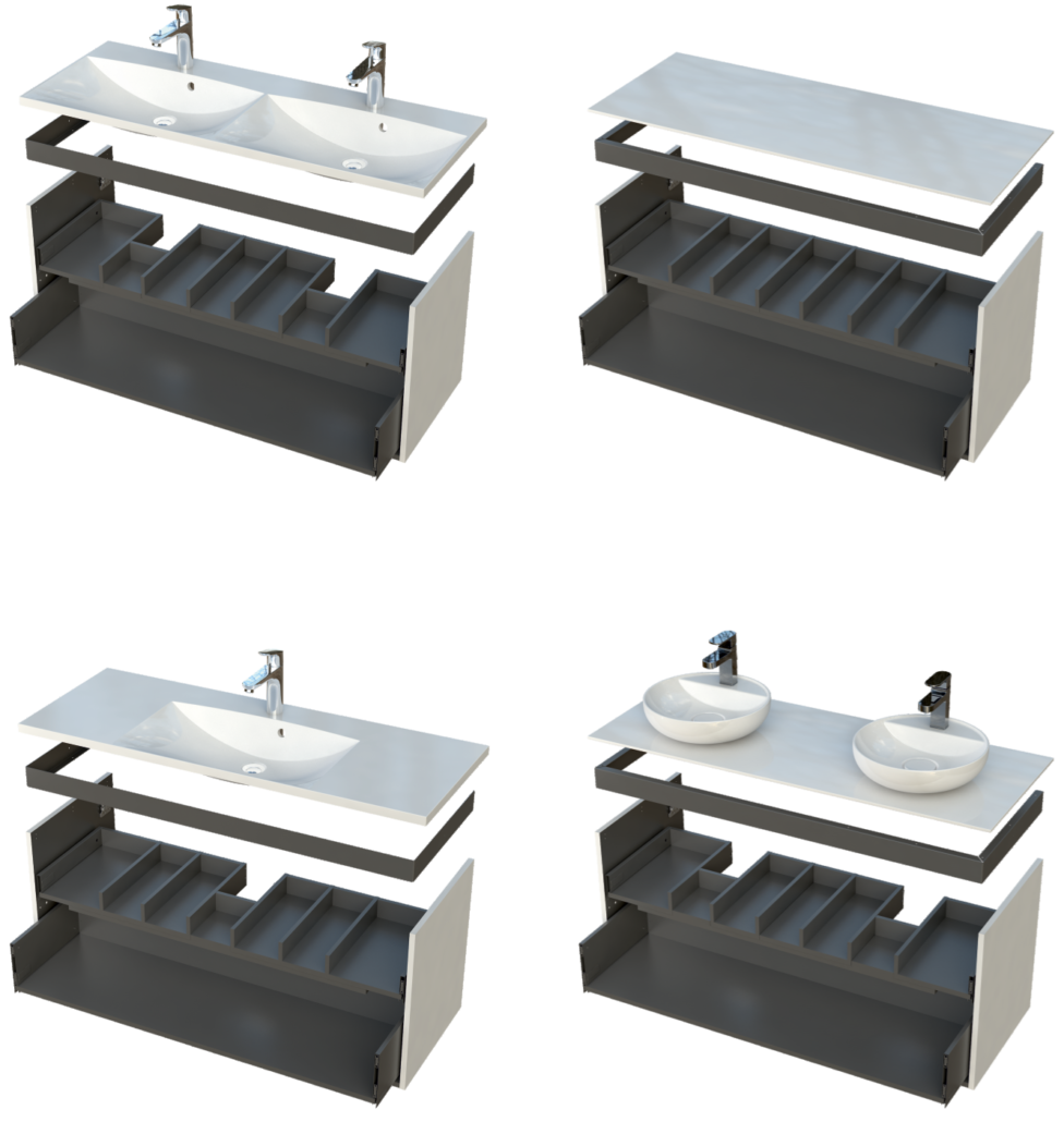 - Szafka podumywalkowa 120 cm, jedna szuflada z dodatkową szufladą wewnętrzną. Kompletowanie: umywalki UNI 120 cm, blaty 120 cm, umywalki nablatowe, nogi UNI.