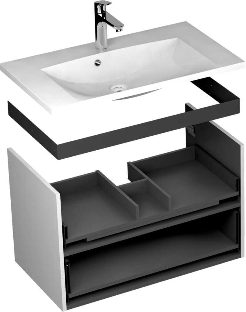 - Szafka z umywalką 50 cm, jedna szuflada z dodatkową szufladą wewnętrzną. Kompletowanie: umywalki UNI 50 cm, blaty 50 cm, umywalki nablatowe, nogi UNI.