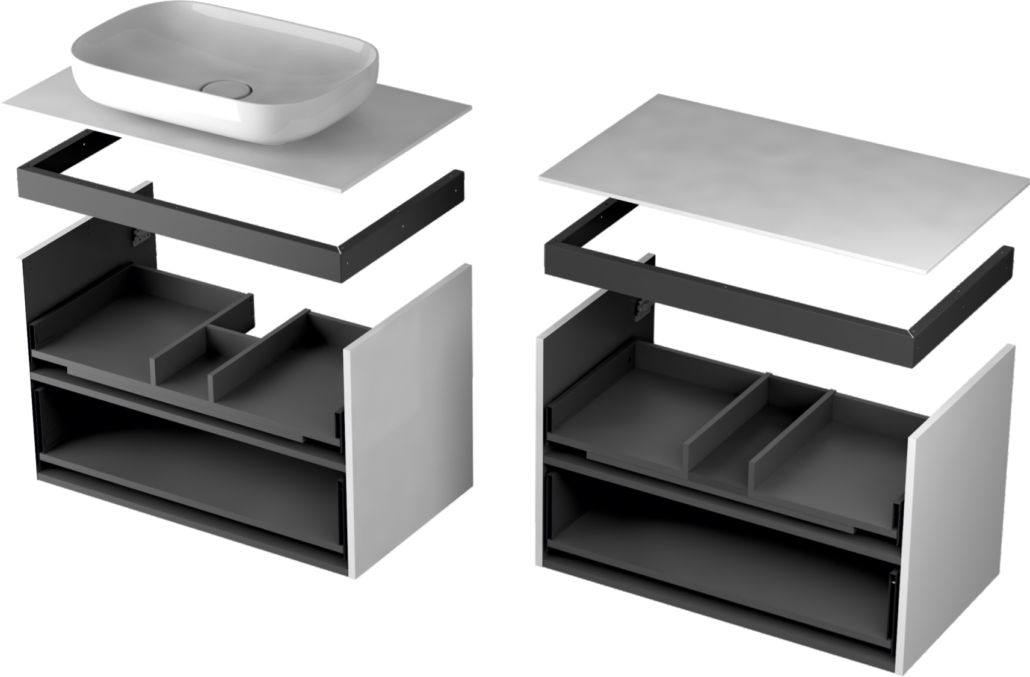 - Szafka z umywalką 80 cm, jedna szuflada z dodatkową szufladą wewnętrzną. Kompletowanie: umywalki UNI 80 cm, blaty 80 cm, umywalki nablatowe, nogi UNI.