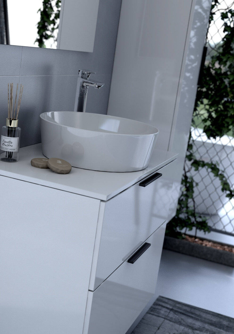 • Szafka pod umywalkę 80 cm w kolorze Biały Połysk z blatem. Produkt nie zawiera umywalki w zestawie.