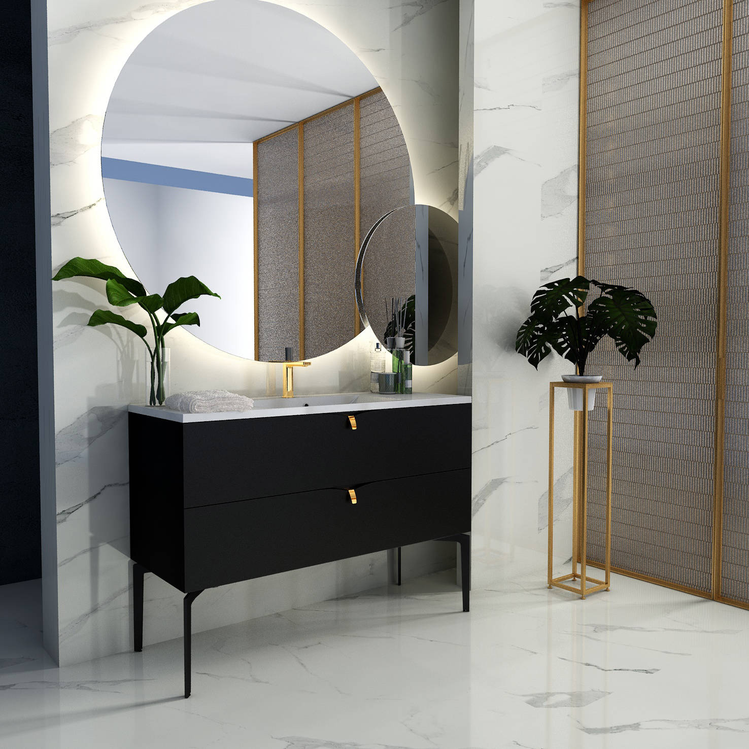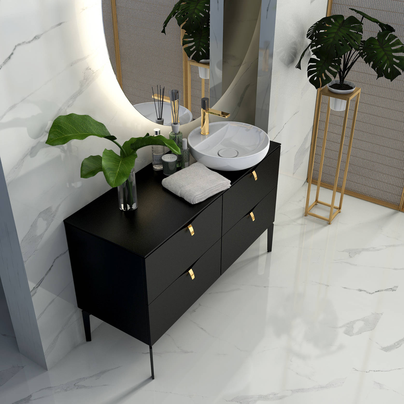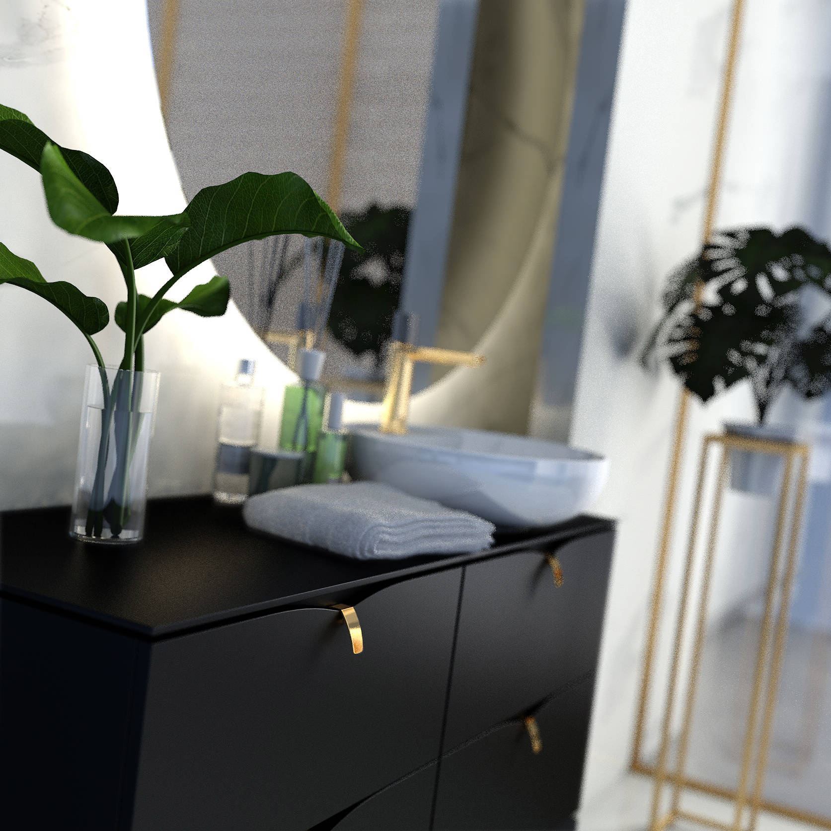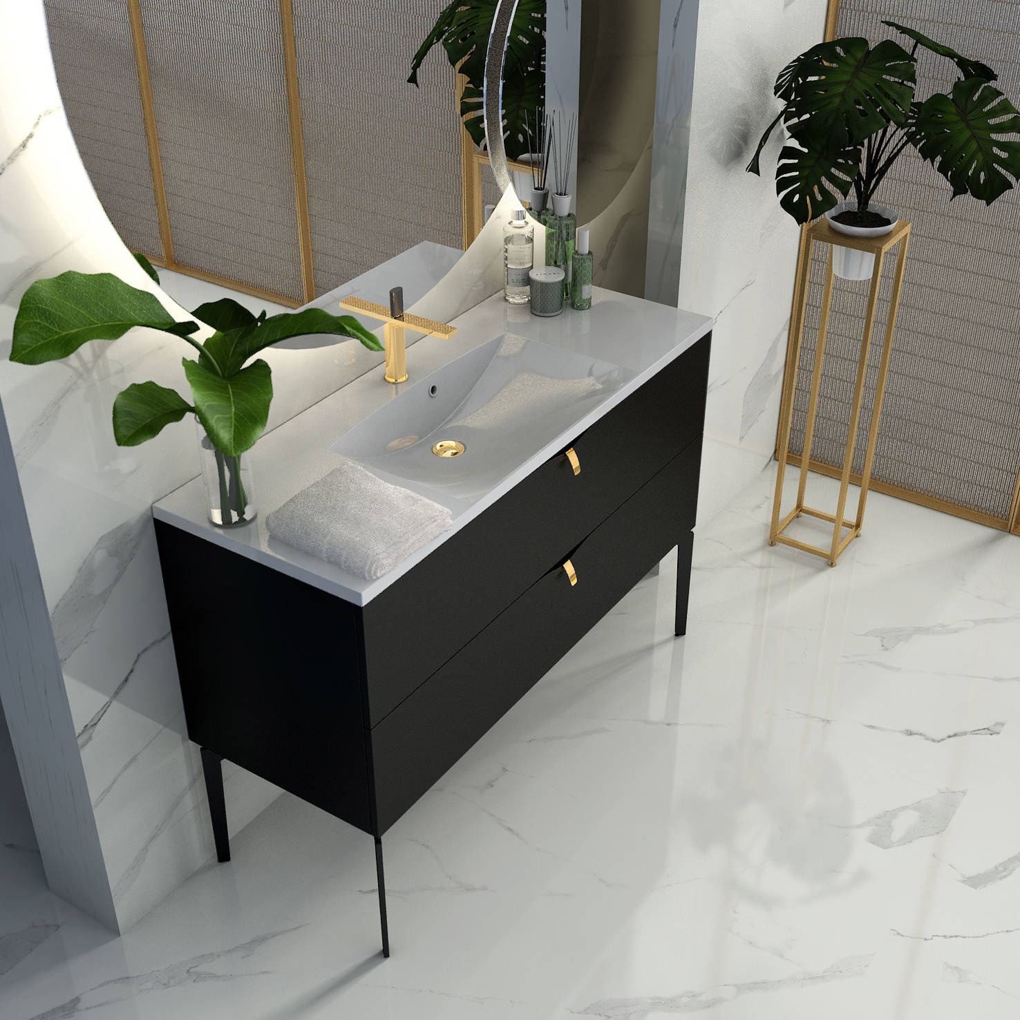 - Szafka z umywalką o szerokości 120 cm w kolorze czarny mat z dwiema szufladami. Uchwyty chromowane w kolorze srebrnym. Możliwość zamówienia uchwytów czarnych.
