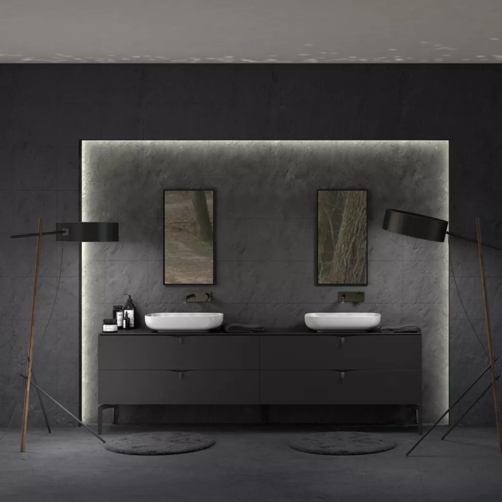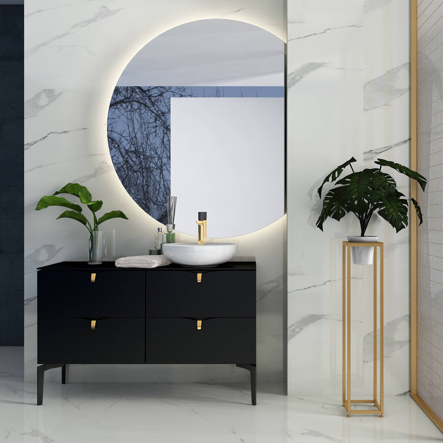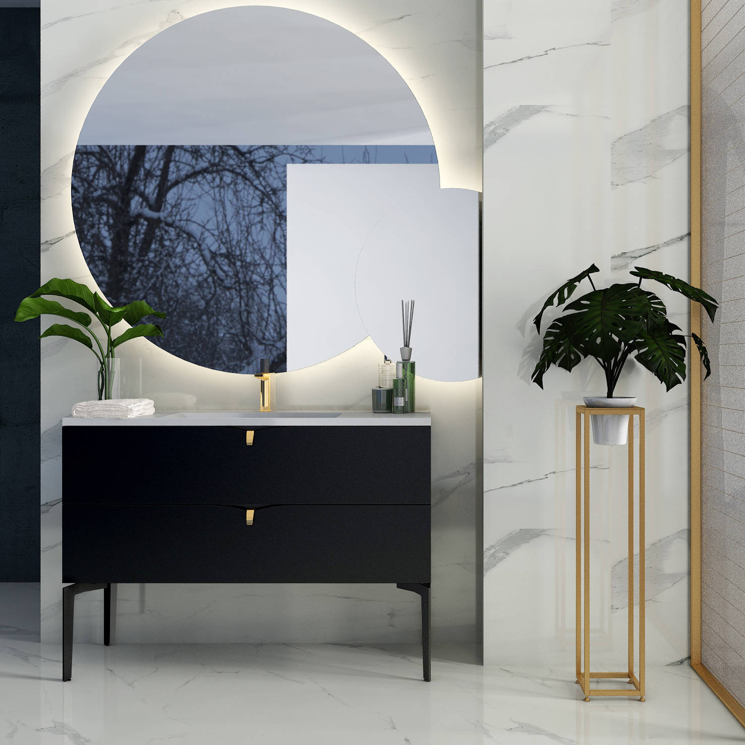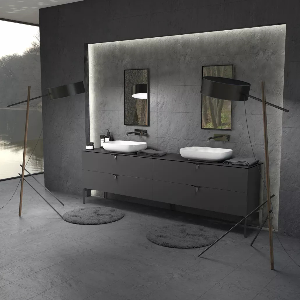 - Szafka z umywalką o szerokości 120 cm w kolorze czarny mat z dwiema szufladami. Uchwyty chromowane w kolorze srebrnym. Możliwość zamówienia uchwytów czarnych.