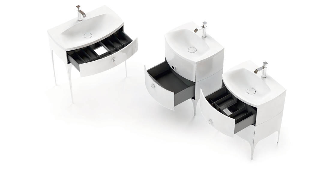 Umywalki dostępne w wymiarach: 62 cm, 82 cm, 102 cm oraz 144 cm (podwójne). Umywalki dostępne w kolorach: biały (konglomerat), biały mat (konglomerat), czarny mat (konglomerat).