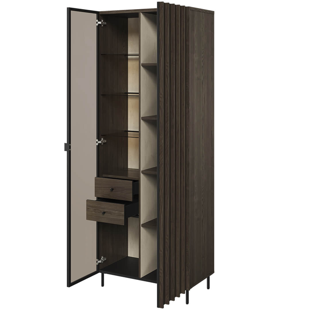 Elegancka witryna PE-02 z kolekcji PIEMONTE o szerokości 73 cm, z szklanymi drzwiczkami i LED oświetleniem, pozwala eksponować zastawę i pamiątki. Nowoczesny design w odcieniach jesion portland/czarny z metalowymi nóżkami dodaje wnętrzu charakteru.