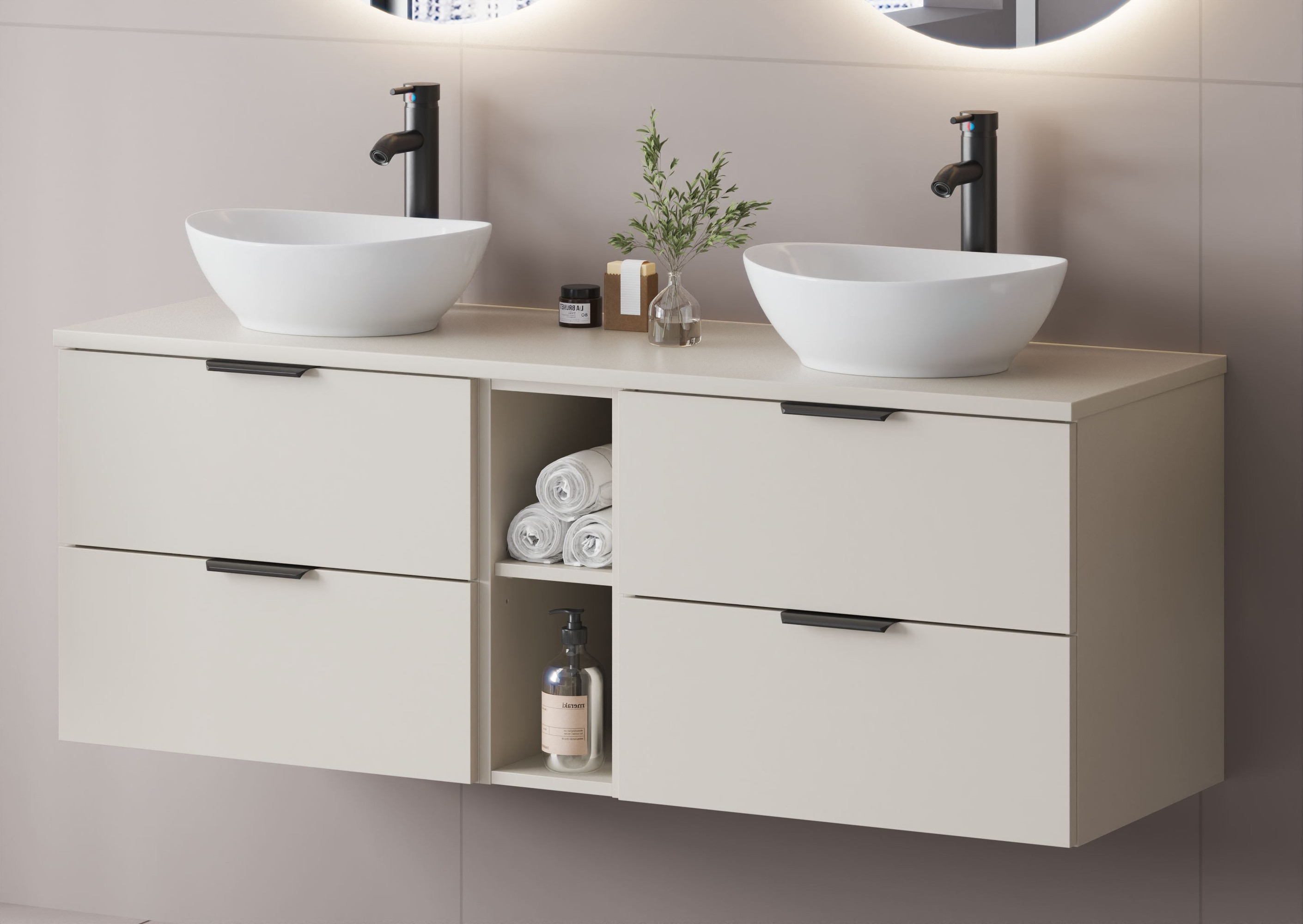 Szafka pod umywalkę PILE-02 łączy nowoczesny design z funkcjonalnością. W kolorze matowego kaszmiru, wykonana z trwałej płyty MDF, idealnie komponuje się w łazience. Wyposażona w eleganckie uchwyty w kolorze czarnego chromu, stanowi stylowe rozwiązanie do
