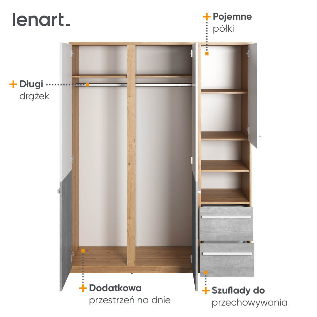 Szukając wyjątkowego rozwiązania do przechowywania w sypialni, warto zwrócić uwagę na szafę PLANO PN-01. Charakterystyczna kombinacja kolorystyczna - dąb nash w połączeniu z szarością mitu grey oraz śnieżną bielą - wkomponuje się idealnie zarówno w przestrzeń dla młodzieży, jak i w nowoczesne aranżacje sypialniane. Stworzona z myślą o maksymalnej funkcjonalności, szafa o szerokości 150 cm, wysokości 191 cm i głębokości 51 cm, oferuje przemyślaną przestrzeń do przechowywania rozmaitych przedmiotów.