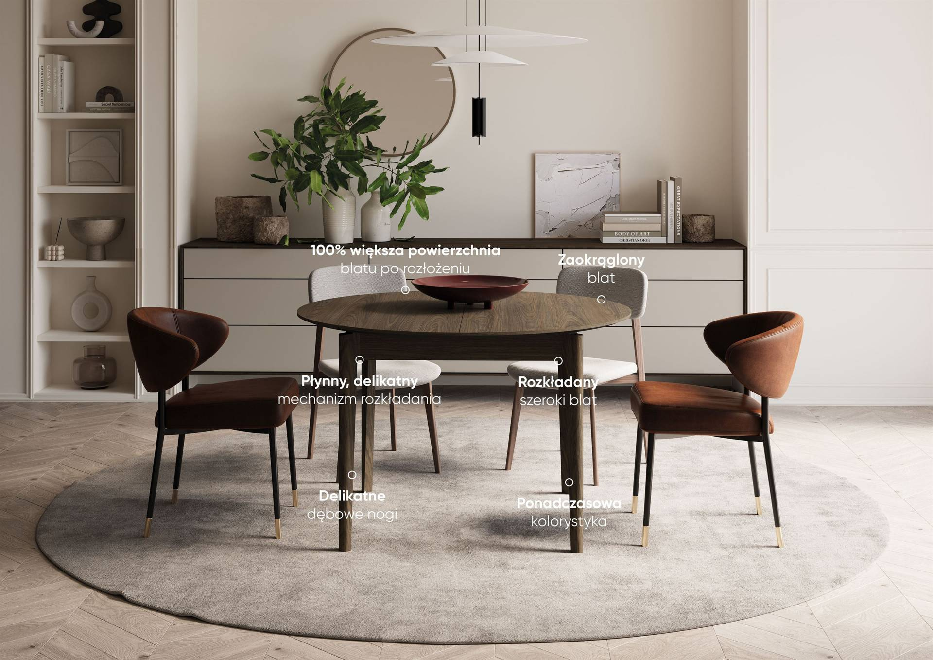 - Odkryj stół rozkładany PLOT PT-04, wykonany z ciemnego dębu. Jego okrągły design sprzyja wspólnym spotkaniom, a funkcja rozkładania pozwala na zwiększenie powierzchni. Idealny na rodzinne uroczystości! Przemień jadalnię w miejsce pełne harmonii.