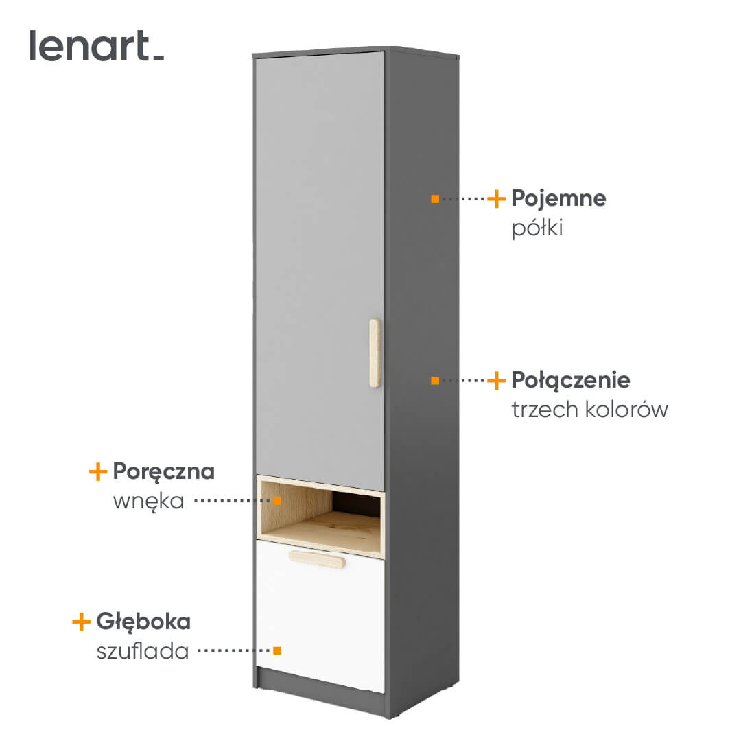 Zastosowana w szafie charakterystyka 1D1S wskazuje na jednodrzwiowy design oraz jedną pojemną szufladę, która wsparta jest na prowadnicach rolkowych, zapewniając płynność ruchu i stabilność. Pięć półek w kolorze szarym jasnym i buku ibsen o udźwigu do 5 kg każda umożliwi idealne uporządkowanie ubrań, zabawek czy akcesoriów szkolnych. Detale, takie jak puszki zawiasowe i uchwyty wykonane z tworzywa są nie tylko efektowne, ale także gwarantują łatwość w obsłudze.