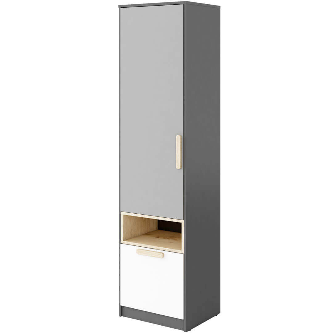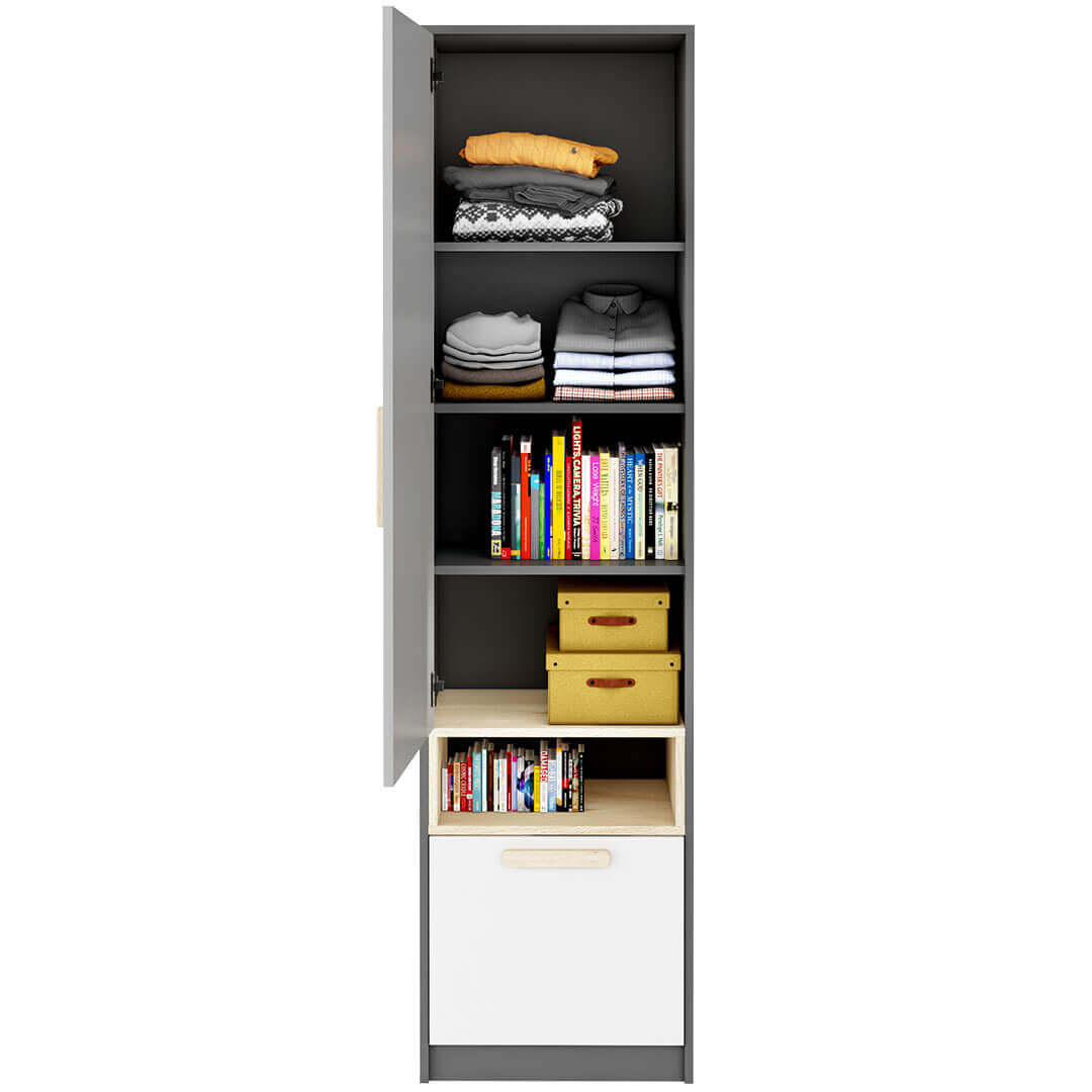 Nowoczesna i praktyczna szafa PO-03 z kolekcji POK łączy grafit, biel i szarość, zapewniając stylowy wygląd. Wew. 5 półek + głęboka szuflada - idealna organizacja przestrzeni. Wymiary: 50x193x40 cm.