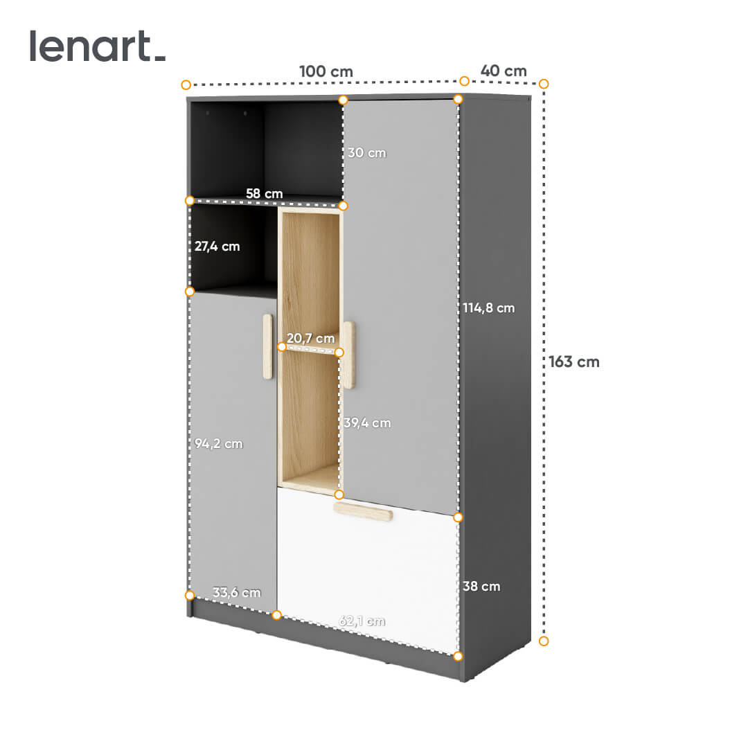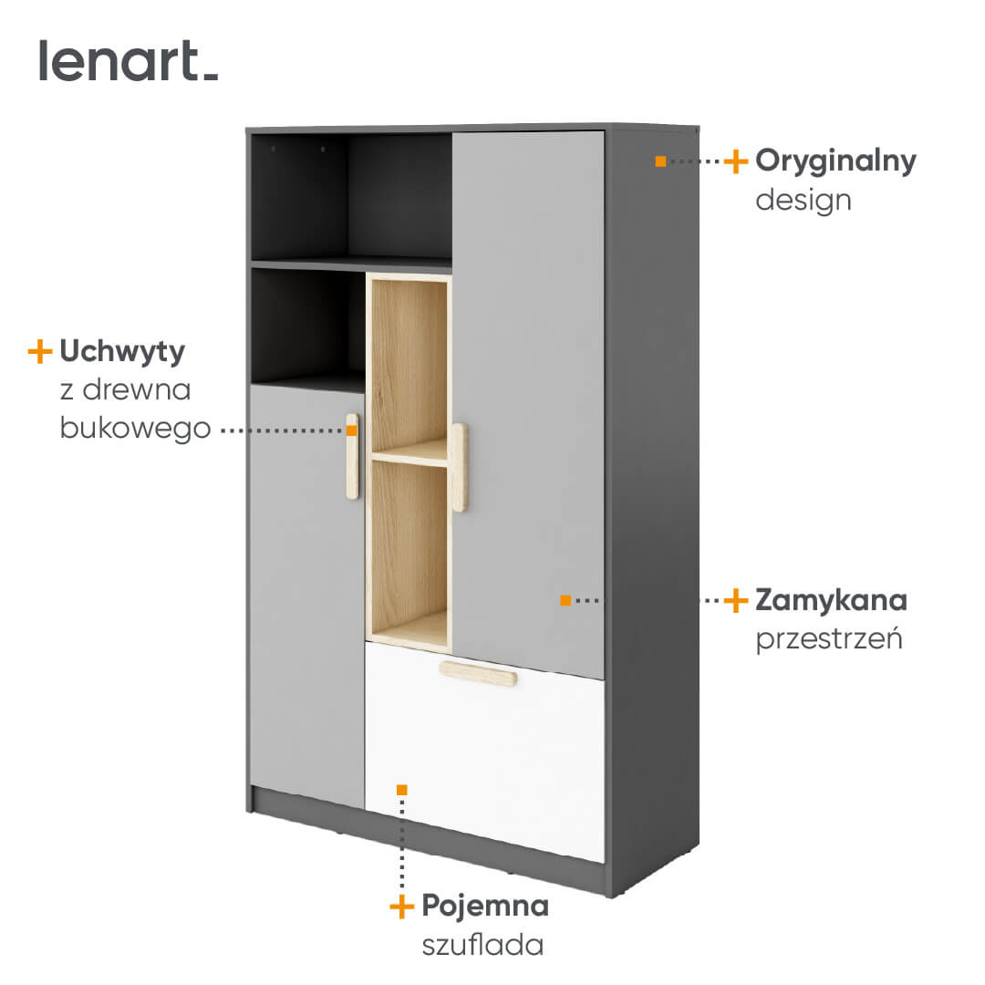 Zwiększ potencjał swojej sypialni z elegancką i funkcjonalną szafką POK PO-05, która dzięki swojej wielofunkcyjności i nowoczesnemu wyglądowi idealnie wpisze się w przestrzeń nowoczesnego domu. Ten średniej wielkości regał z kolekcji POK urzeka połączeniem grafitu, buka ibsena i jasnej szarości, tworząc estetyczne i spójne dopełnienie każdego pokoju młodzieżowego czy też innego rodzaju wnętrza.