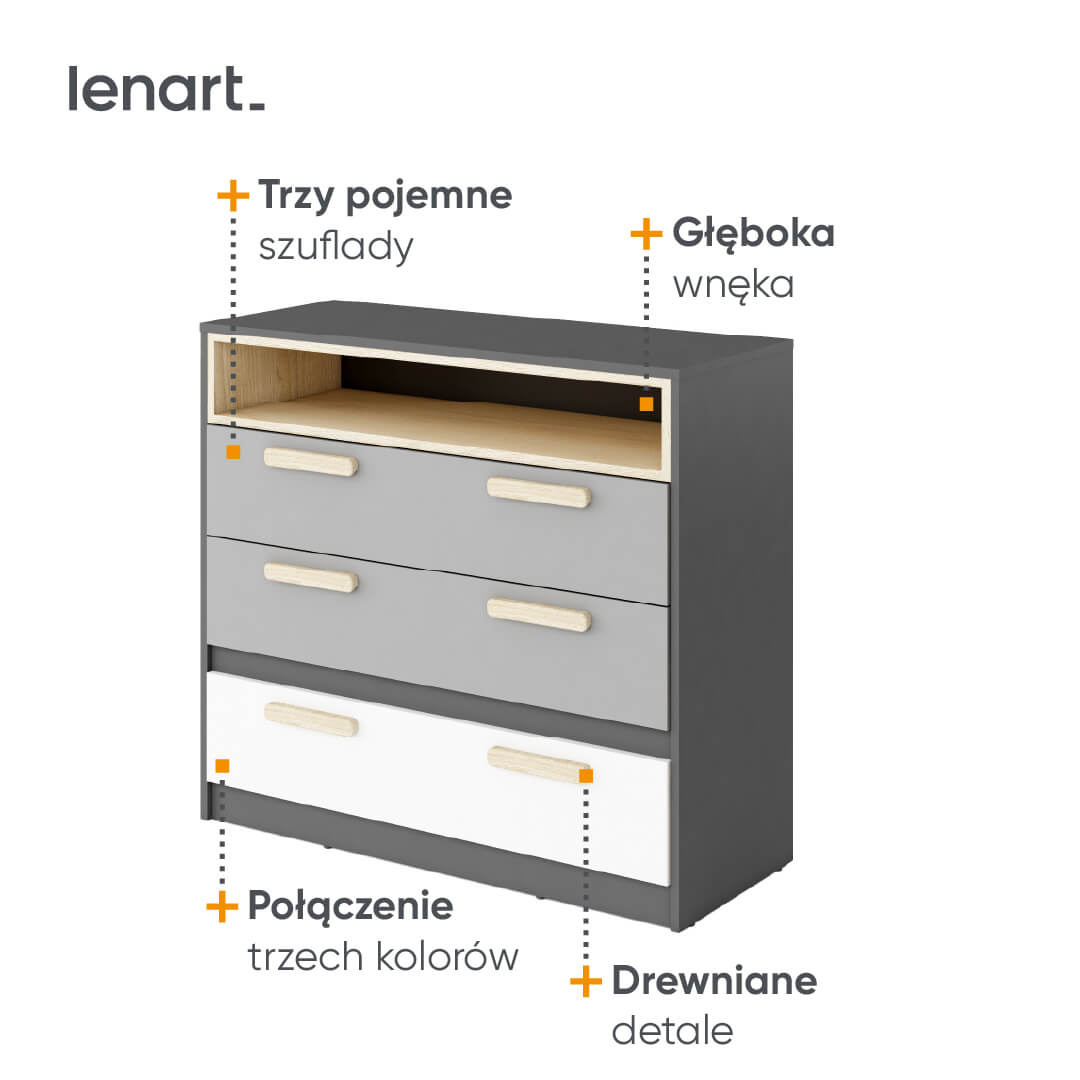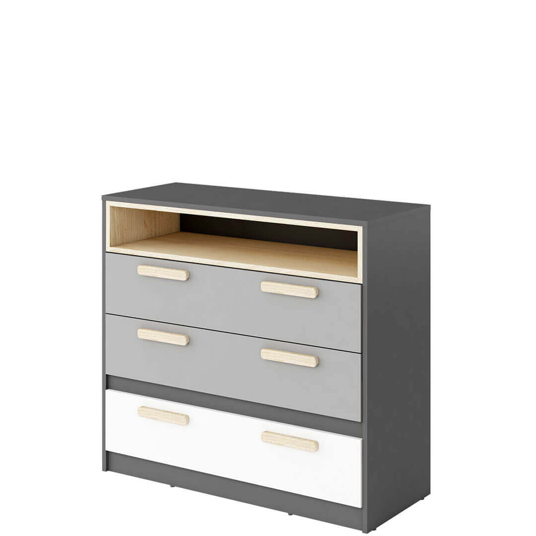 Nowoczesna komoda PO-08 z kolekcji POK, wyróżniająca się trójkolorowym designem i praktyczną wnęką. Masywne uchwyty bukowe i trzy przestronne szuflady zapewniają komfort użytkowania i łatwość w aranżacji wnętrz.
