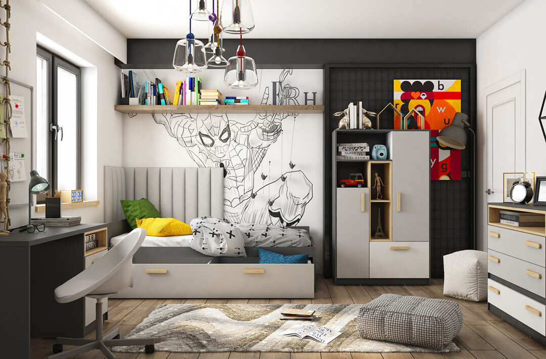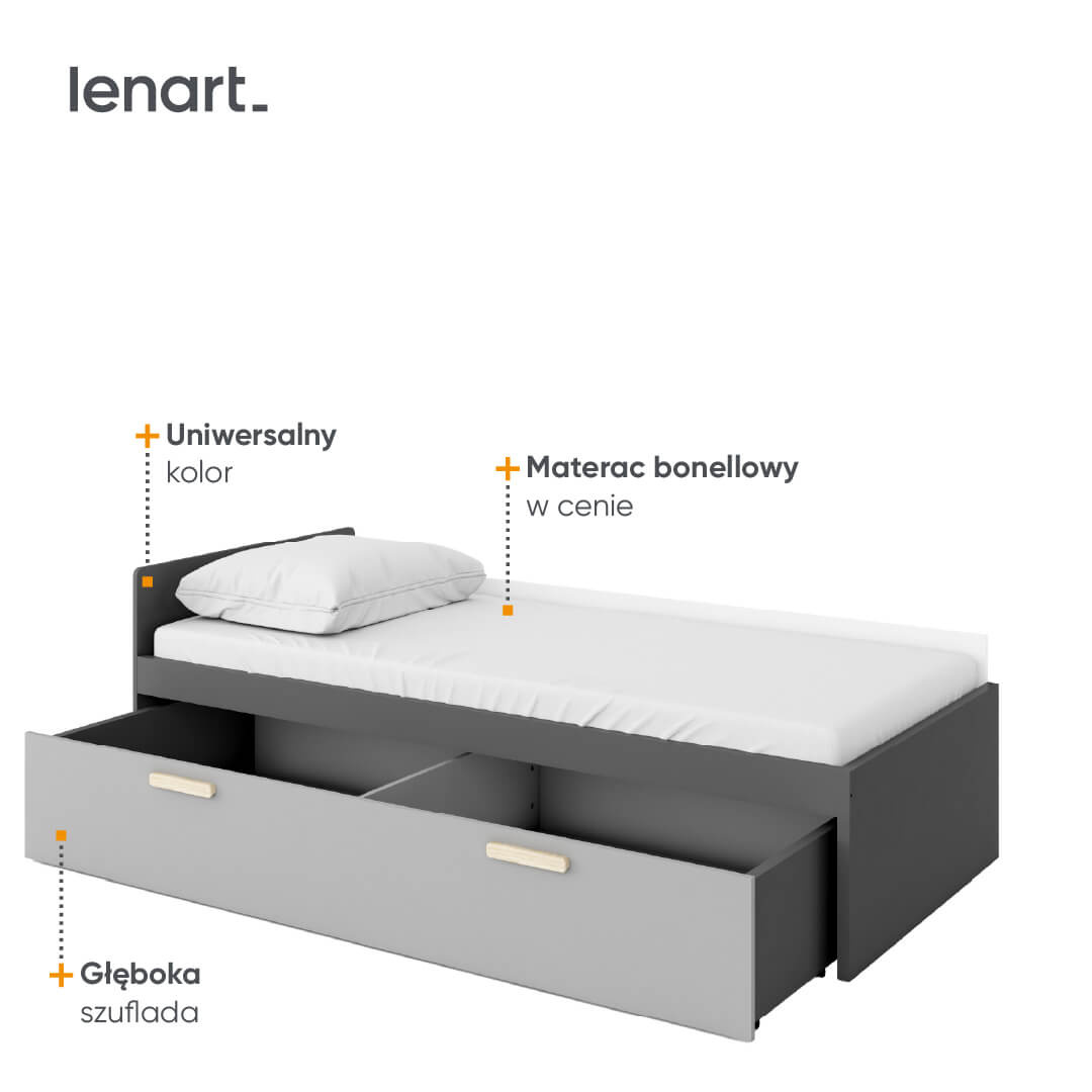 Nasz produkt nawiązuje do współczesnych trendów w designie, łącząc w sobie trzy kontrastujące odcienie: intymny grafit, ciepły buk ibsen oraz delikatny szary jasny. Takie połączenie barw zapewnia pełną harmonię i ułatwia dopasowanie do różnorodnych aranżacji, od sypialni po pokój młodzieżowy, tworząc przestrzeń pełną spokoju i równowagi.