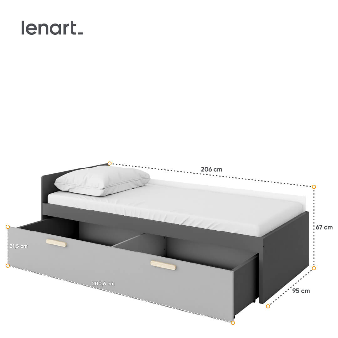 Wymiary szuflady, czyli 200 cm szerokości, 32 cm wysokości oraz 83 cm głębokości, zapewniają spory obszar do przechowywania tekstyliów sypialnianych, takich jak bedding, kołdry czy inne niezbędne akcesoria. Waga konstrukcji, wynosząca 34 kg, świadczy o solidności i stabilności mebla.