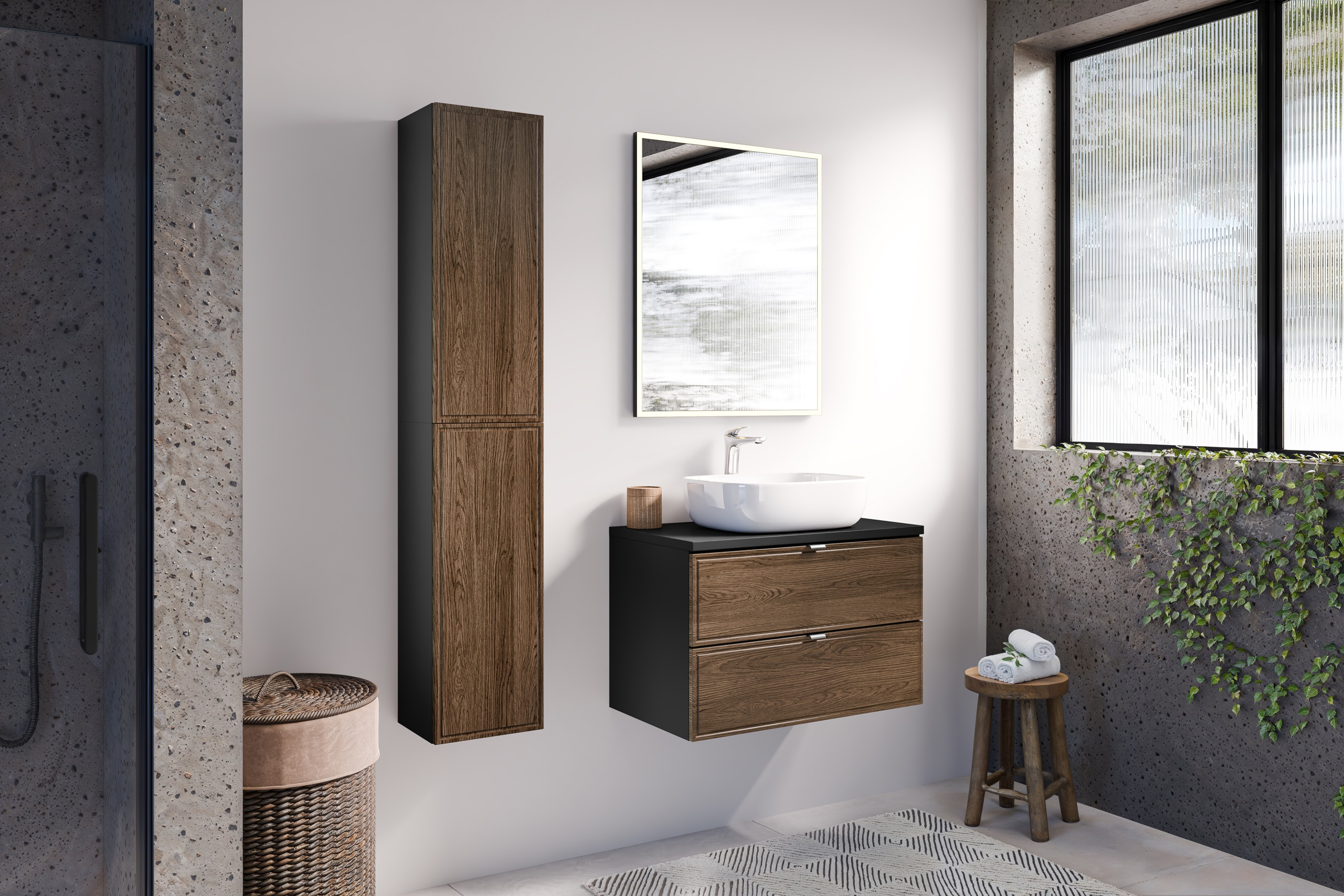 Półsłupek łazienkowy Talia Casella łączy elegancję z nowoczesnością. Charakteryzuje się frezowanymi frontami w dekorze Dąb Casella oraz matowym czarnym korpusem. Dzięki systemowi "push to open" oraz cichym domykaniu, korzystanie z niego jest wygodne.