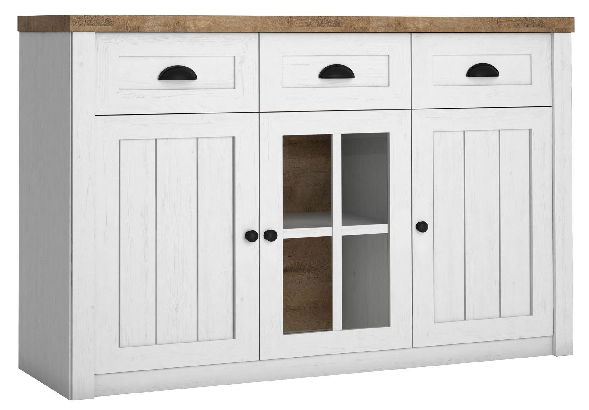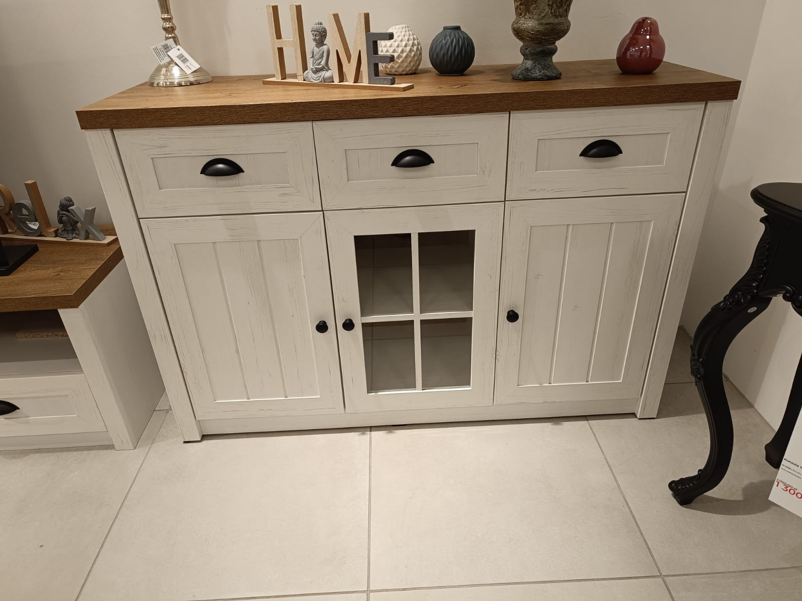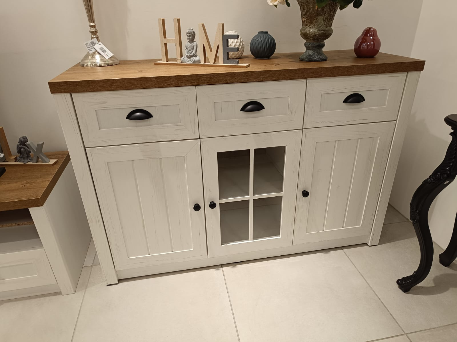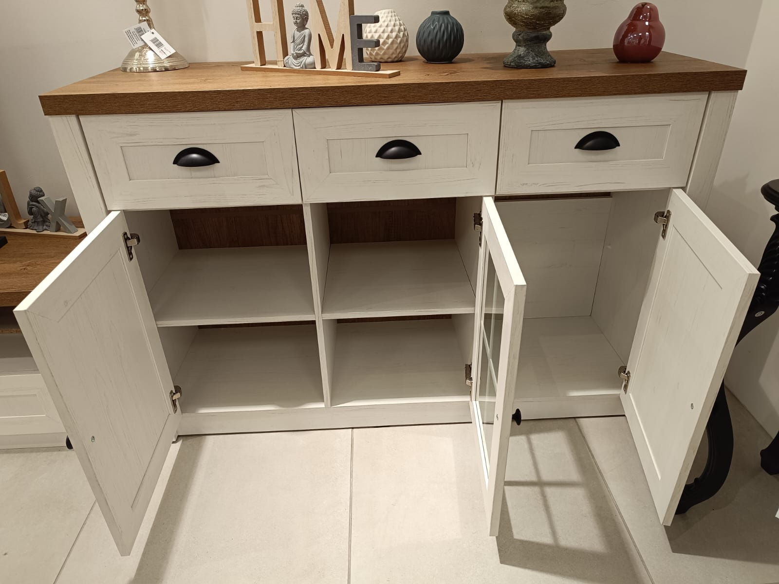 - Elegancka komoda o szerokości 130 cm z trojgiem drzwiczek, przeszkleniem z półką i trzema szufladami w kolorze białym z czarnymi uchwytami i blatem w kolorze drewna.