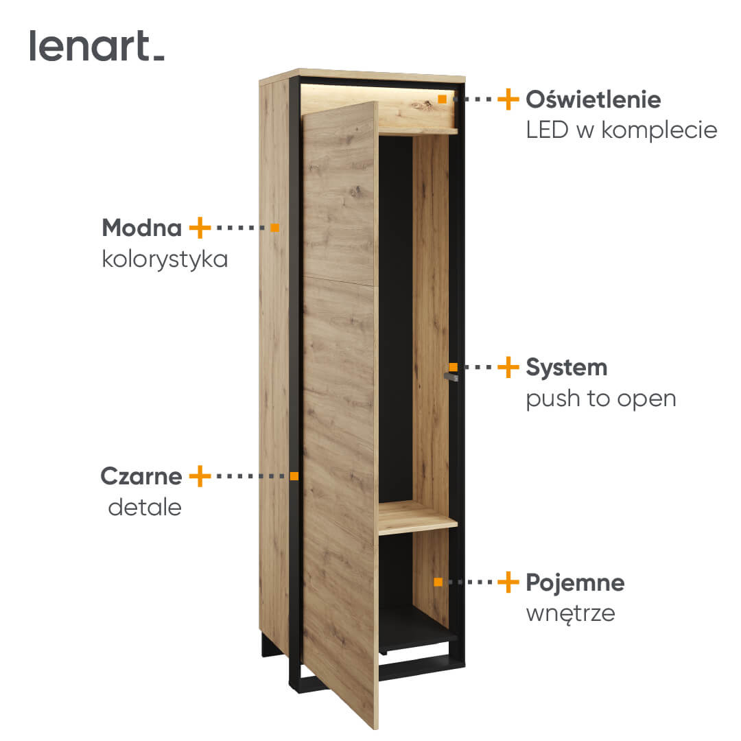 - Elegancka szafa QUANT GARDEROBA QG-01 w odcieniach dębu artisan i czerni, z funkcjonalnym LED’em. Kompaktowe wymiary (60x200x40 cm) i system "push-open" świetnie wpasują się w każdy przedpokój.
