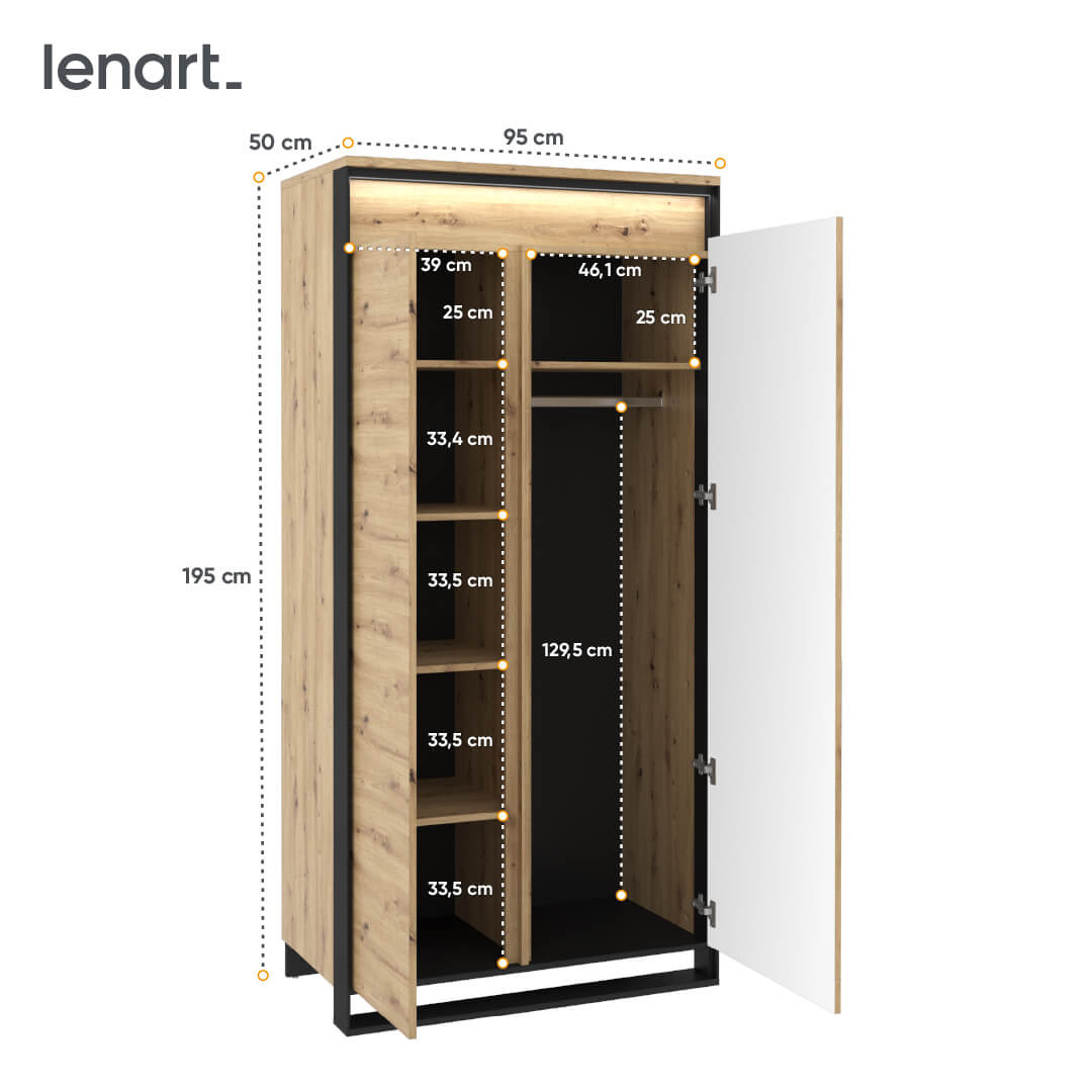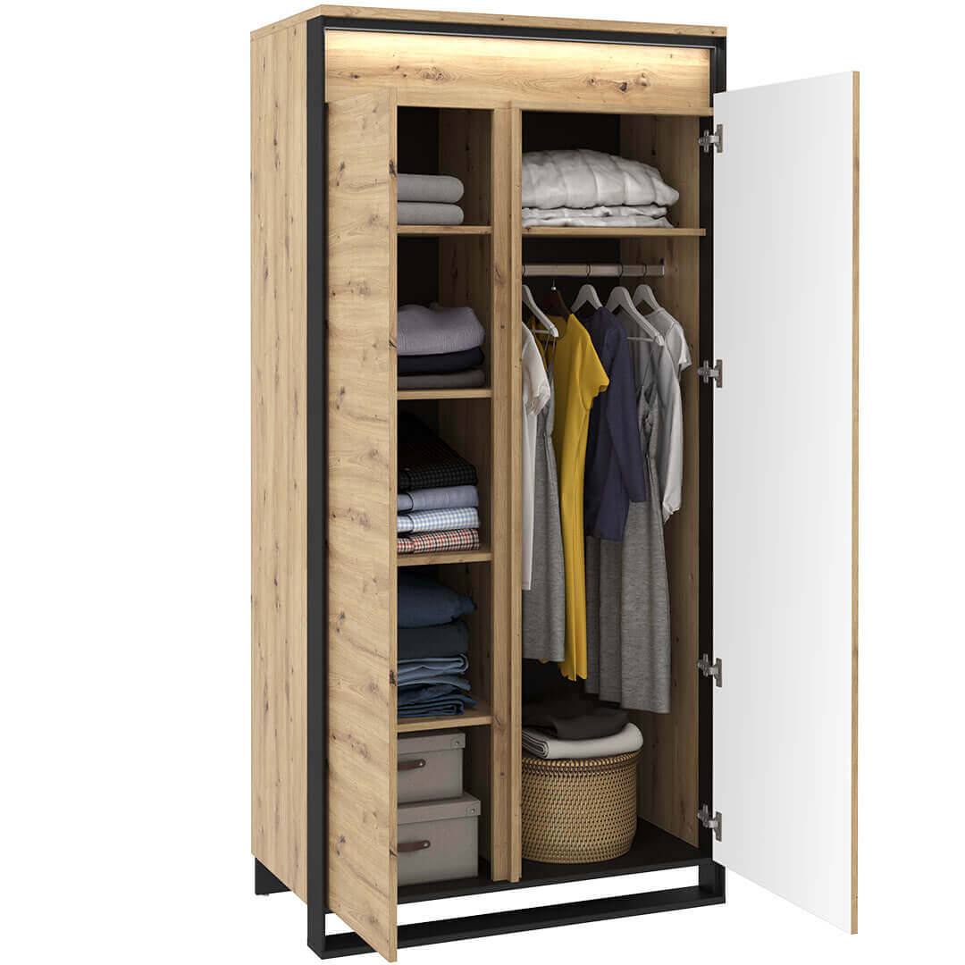 Praktyczna szafa QUANT QA-01 w kolorze dąb artisan/czarny, łącząca w sobie drążek i półki, oświetlona taśmą LED. Nowoczesny design z systemem PUSH TO OPEN pasujący do każdej przestrzeni.