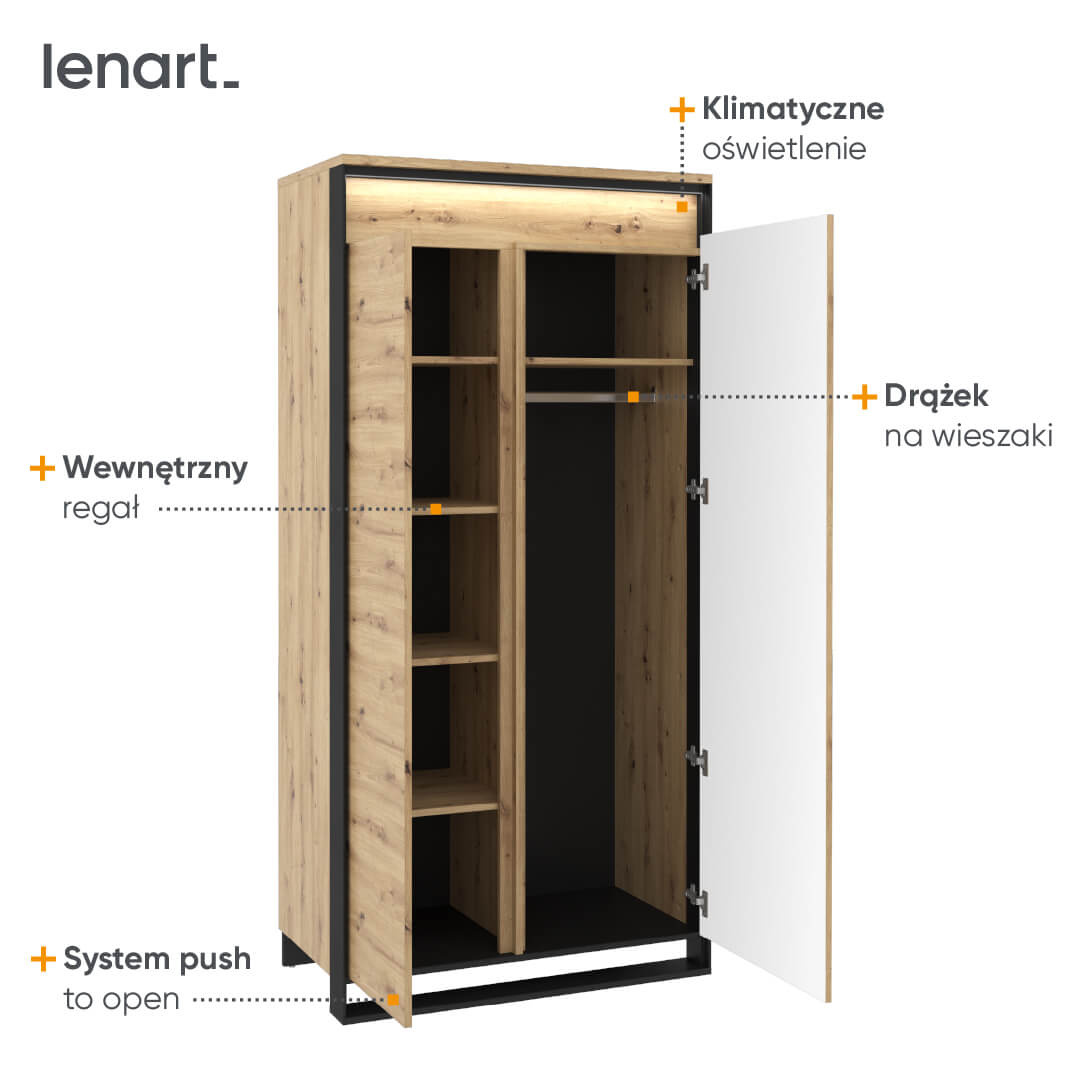 - Praktyczna szafa QUANT QA-01 w kolorze dąb artisan/czarny, łącząca w sobie drążek i półki, oświetlona taśmą LED. Nowoczesny design z systemem PUSH TO OPEN pasujący do każdej przestrzeni.