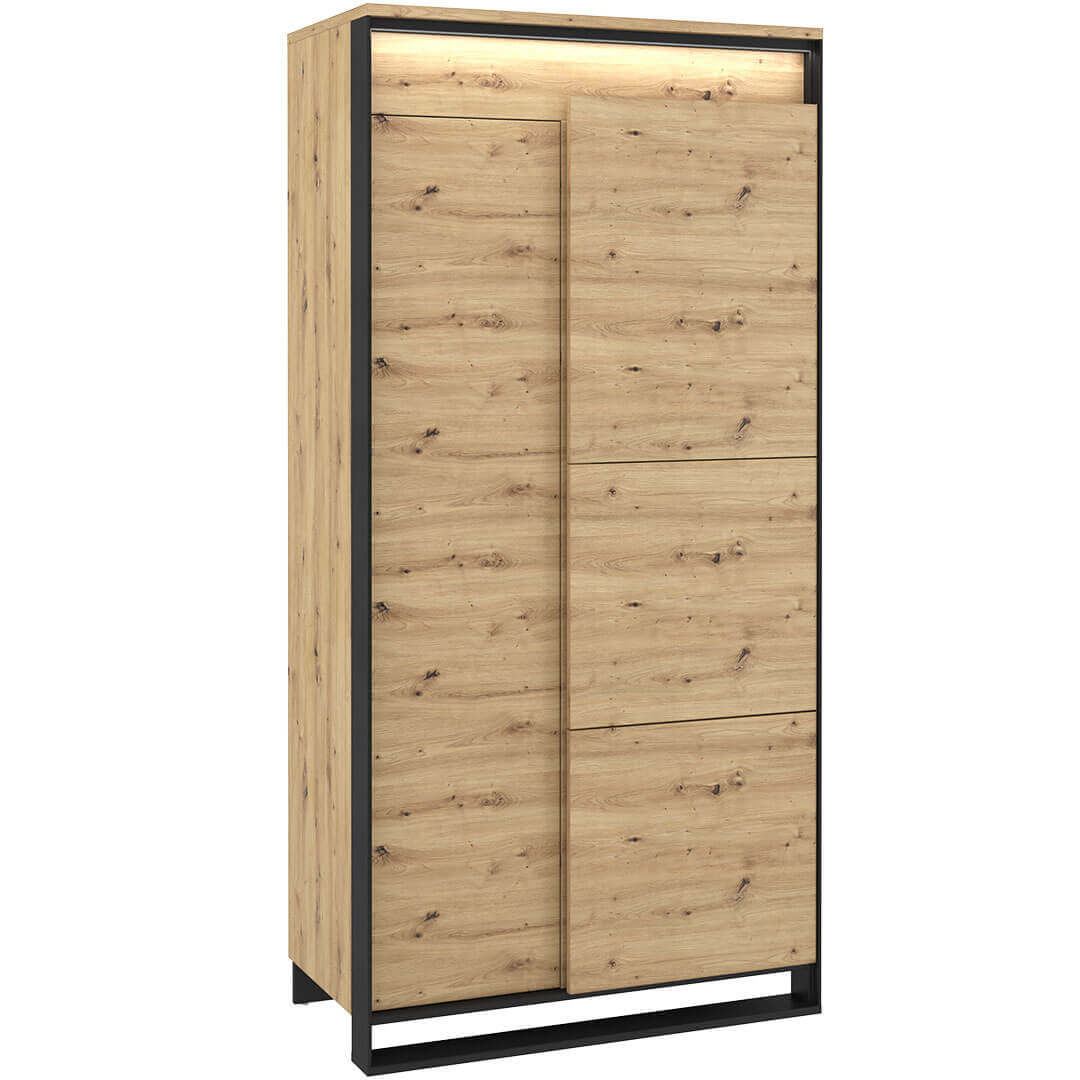 Zewnętrzna elegancja w odcieniu dąb artisan jest przełamana czarnymi akcentami, tworząc wyraziste, ale harmonijne połączenie kolorystyczne, które wniesie do pomieszczenia nutę nowoczesnej wyrafinowanej atmosfery. Front szafy, wykończony obrzeżem ABS, sprawia wrażenie dynamicznego dzięki trójwymiarowemu charakterowi i subtelnemu ledowemu oświetleniu, które dodatkowo podkreśla jej formę i ułatwia korzystanie z zawartości po zmroku.