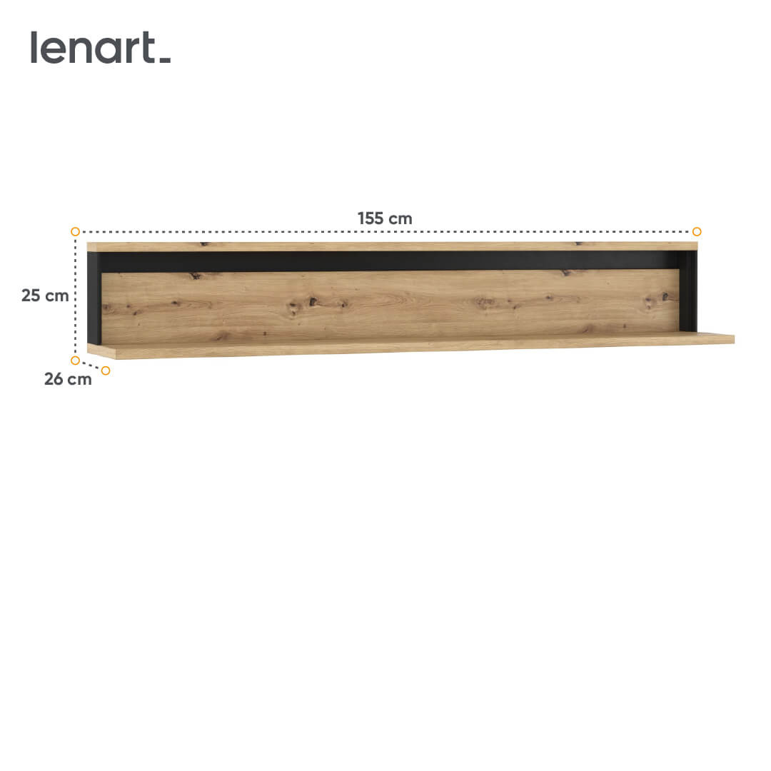 Z uwagi na szerokość 155 cm, wysokość 25 cm, głębokość 26 cm oraz dopuszczalne obciążenie półki do 5 kg, mebel ten pozwoli na wygodne przechowywanie książek, różnorodnych dekoracji czy niezbędnych przedmiotów, przy zachowaniu estetycznego wyglądu i minimalizmu formy. Elegancko wykończone krawędzie półki ABS o grubości 0,45mm, oklejone ze wszystkich stron, świadczą o dbałości o każdy detal.