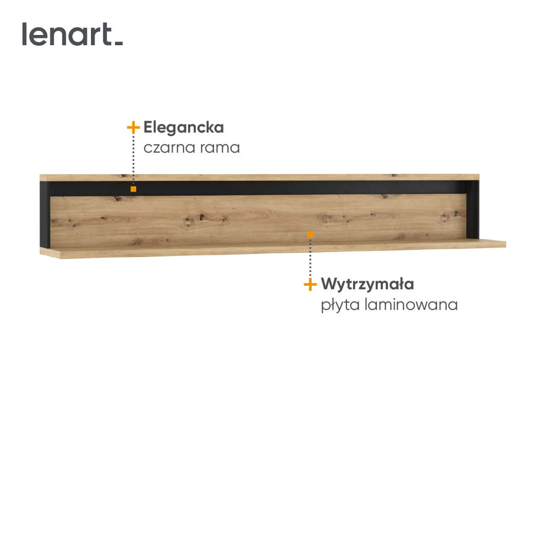 QUANT QA-05: nowoczesna półka wisząca w odcieniu dębu artisan z akcentem czarnym, tworzy przestrzeń na książki i ozdoby. Wytrzymała, łatwa w montażu, idealna nad komodą. Wym: 155x25x26cm.
