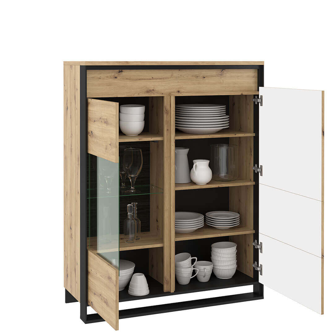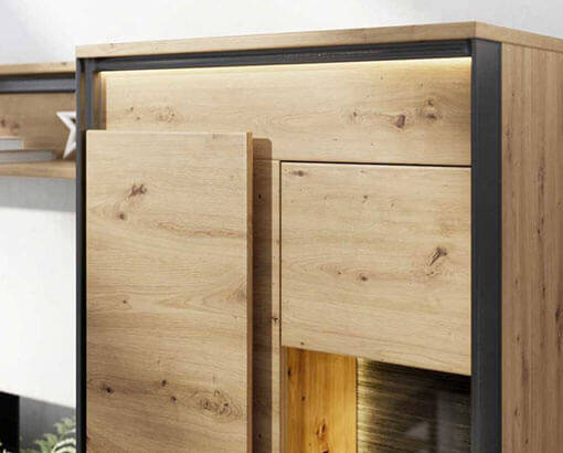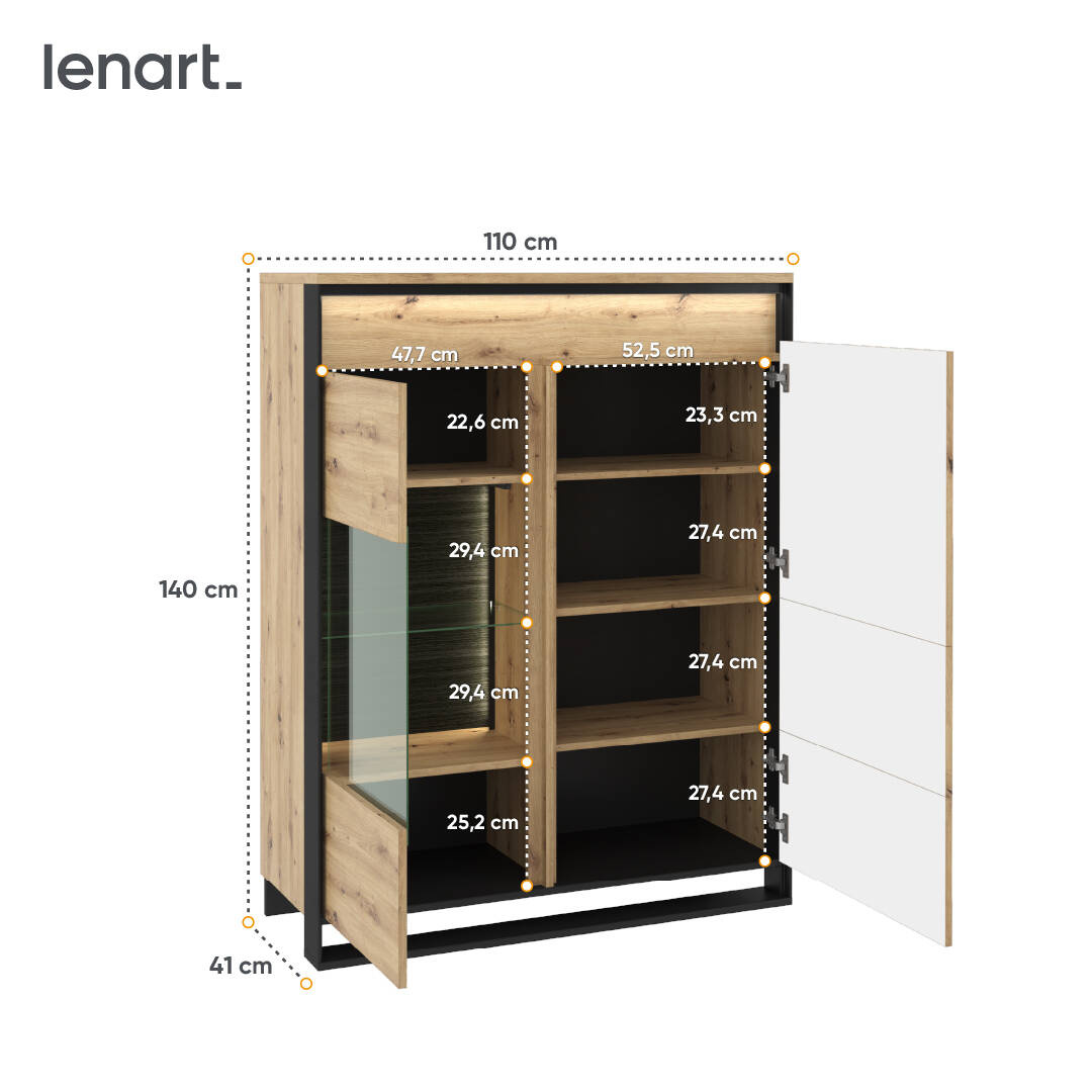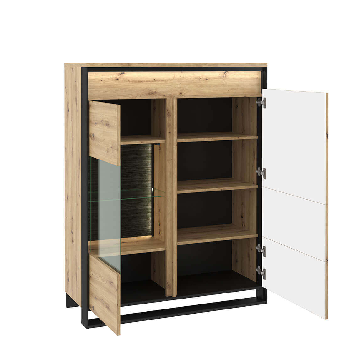 Elegancka witryna QUANT QA-06 łączy w sobie styl loftowy z praktycznością - przeszklony segment z opcjonalnym LED-em eksponuje dekoracje, a zamknięte półki ukryją niezbędne przedmioty. Wykończona w odcieniach dębu artisan i czerni, zewnętrzne oświetlenie